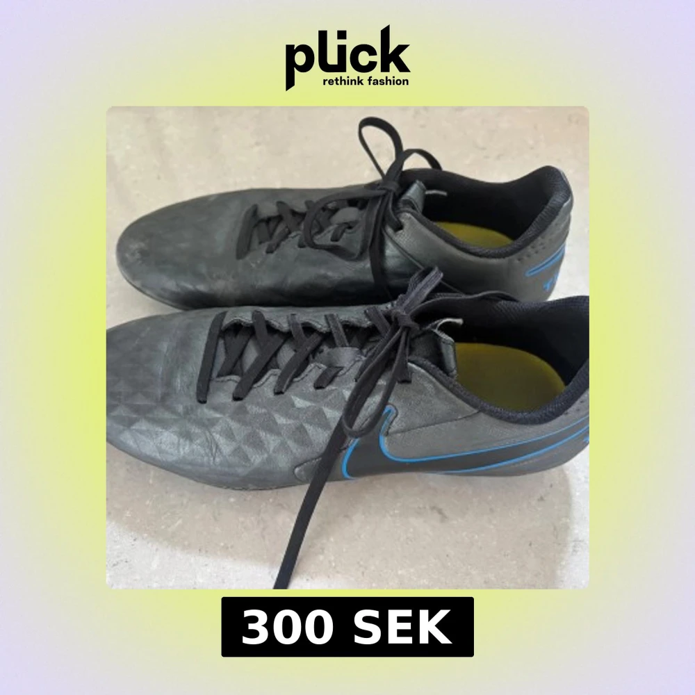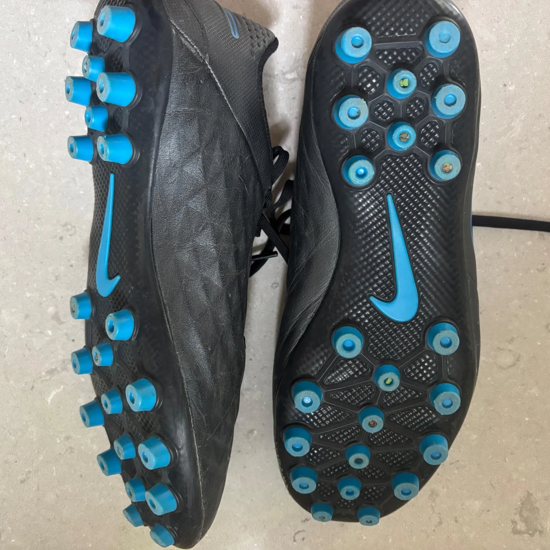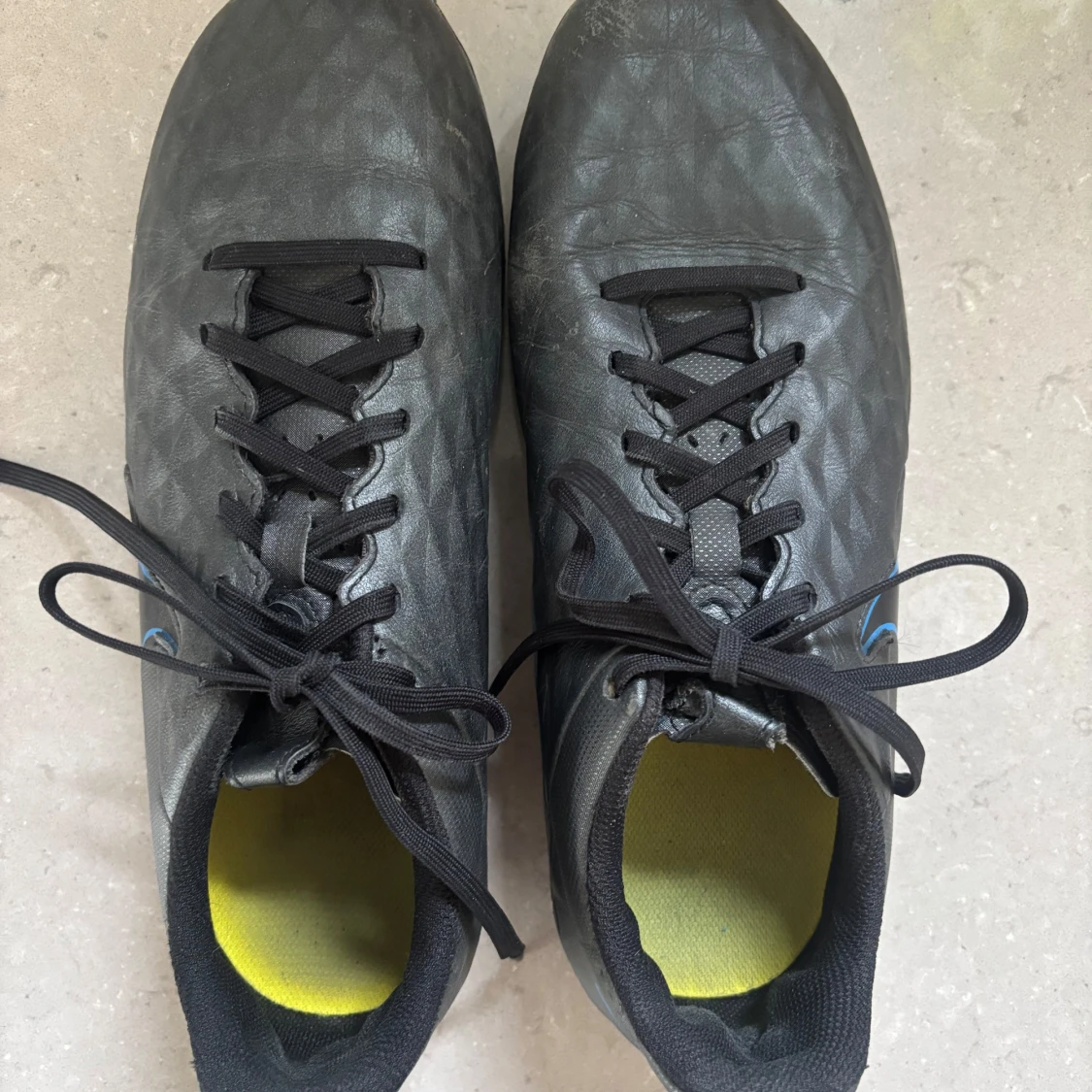 Ett par svarta Nike Tiempo fotbollsskor med blå detaljer och dobbar. Använda men väl omhändertagna.