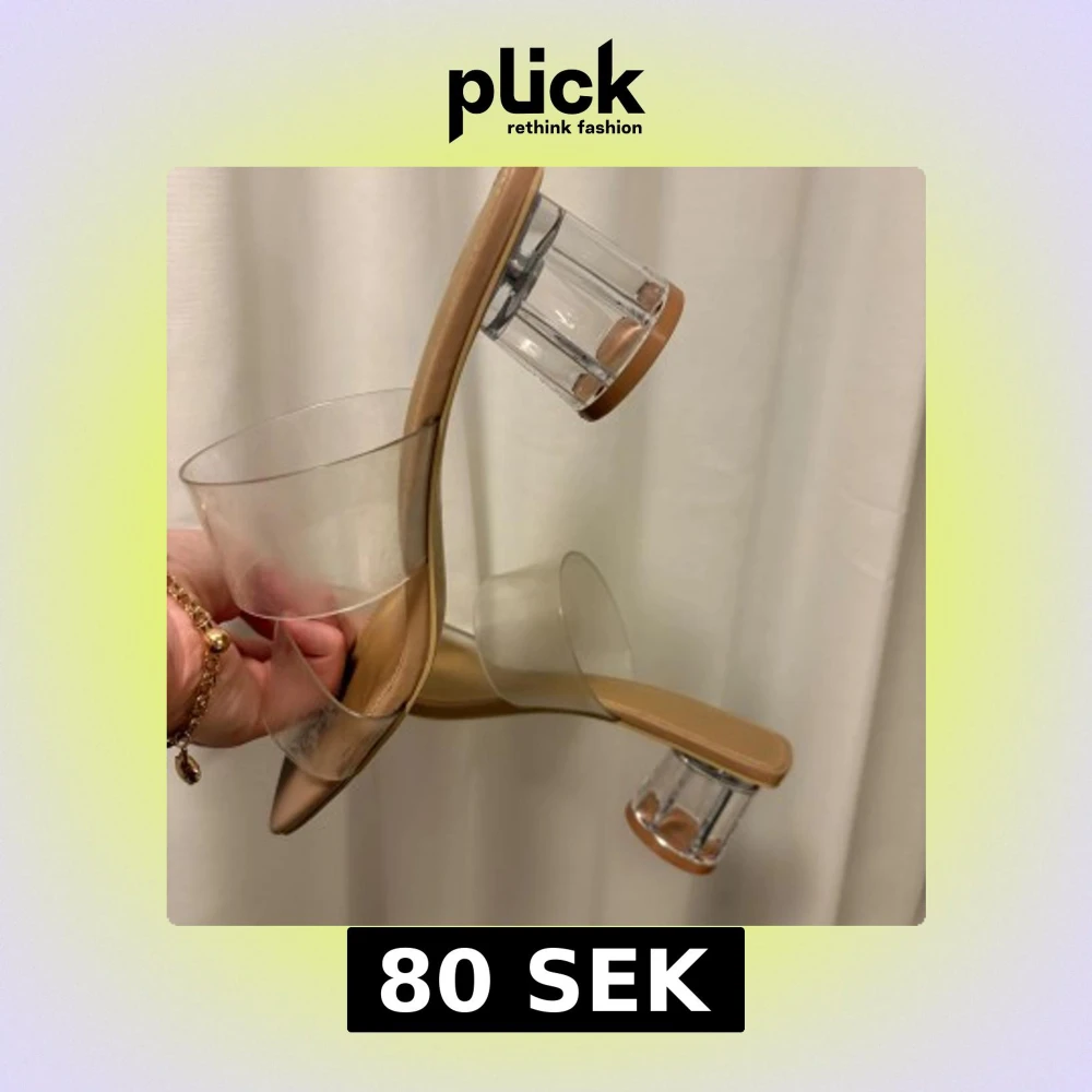 Säljer ett par trendiga klackskor från H&M i storlek 38. Skorna har transparenta remmar i syntet och en cool, klar cylinderformad klack. Beige innersula och fyrkantig tå ger en modern vibe. Perfekta för dig som gillar statement heels!