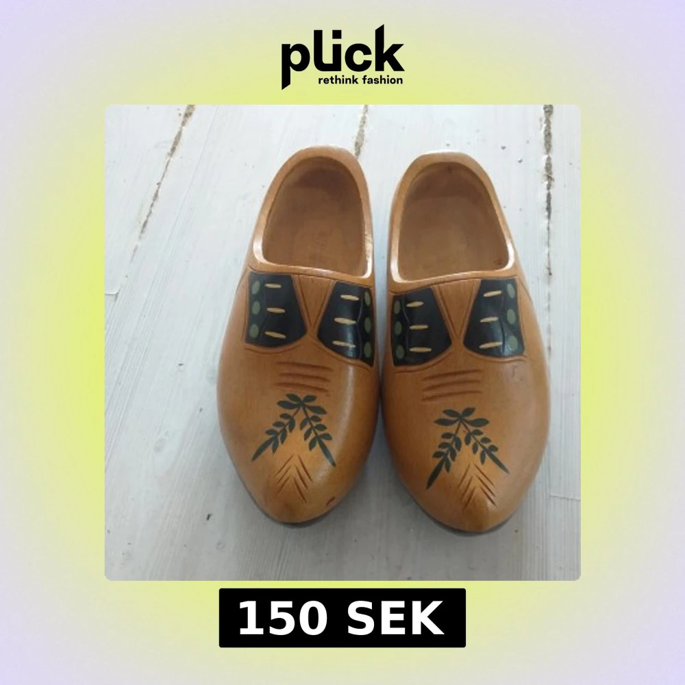 Unika träskor i ljusbrunt trä med spetsig tå och handmålade svarta och gröna mönster framtill. Skorna har en klassisk form och är dekorerade med bladmotiv och grafiska detaljer. Perfekta för dig som gillar traditionell stil med en twist.