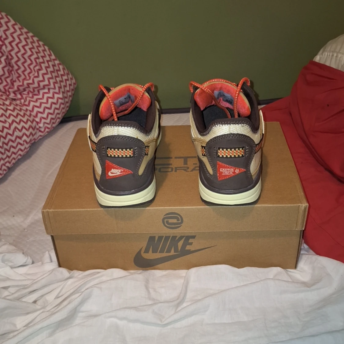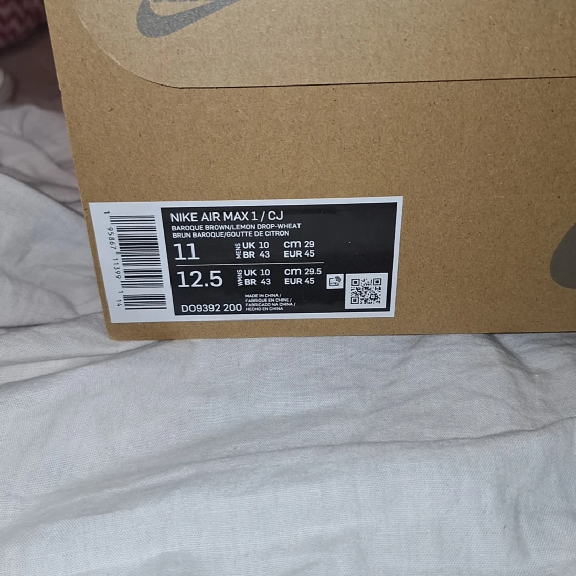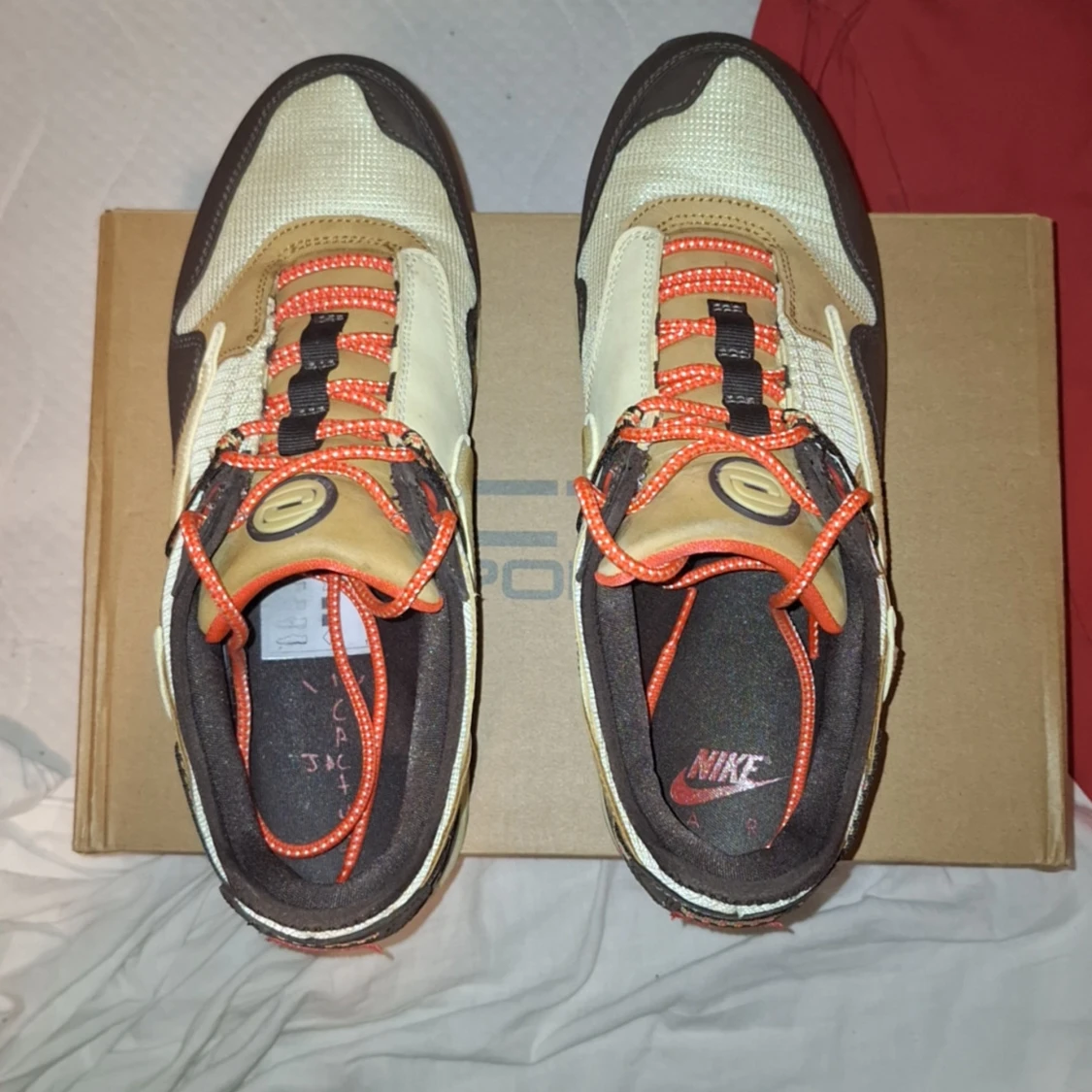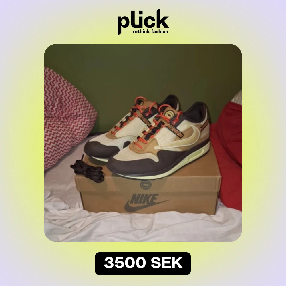 Storlek 45, Travis Scott Air Max 1's Låda och ett par bruna skosnören ingår :) Har kvitto kvar om det behövs annars är det bara att fråga på.
