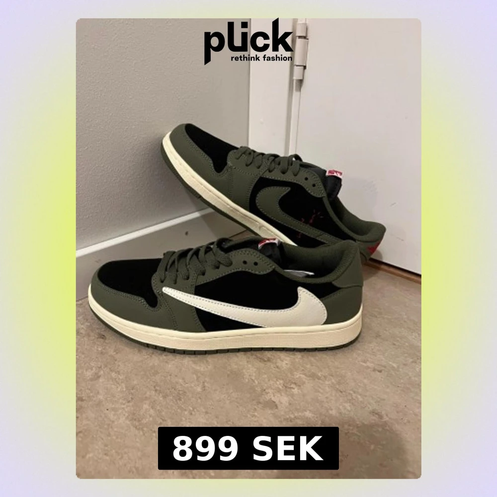 Nike Air Jordan 1 Low Travis Scott i olivgrönt och svart med vit omvänd swoosh. Skorna har röda broderade detaljer på hälen och klassisk snörning. Ovandelen är i skinn och mocka, med en platt sula i beige. Perfekt för dig som gillar streetwear och unika sneakers.
