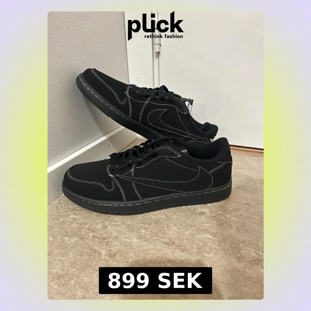 Snygga Nike Air Jordan 1 Low i helsvart mocka med vita kontrastsömmar. Klassisk siluett med rund tå, svart platt sula och svart snörning. Perfekta för dig som gillar stilrena sneakers med en twist. Ikonisk Nike Air-logga på plösen.