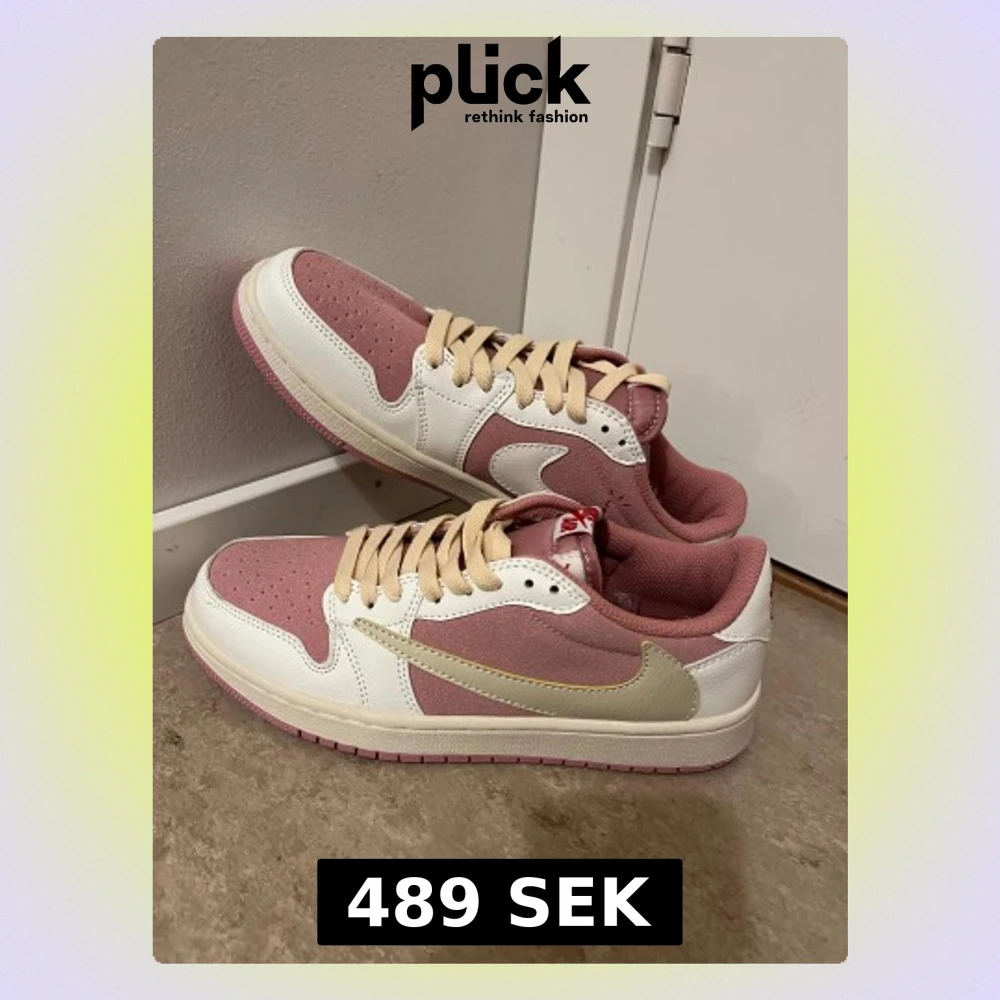 Nike Air Jordan 1 Low sneakers i en snygg kombo av ljusrosa och vitt med beige snörning. Ovandelen är i mocka och skinn, med klassisk rund tå och platt sula. Yttersulan är rosa och loggan syns på tungan och hälen. Perfekt för dig som gillar stilrena och trendiga sneakers.