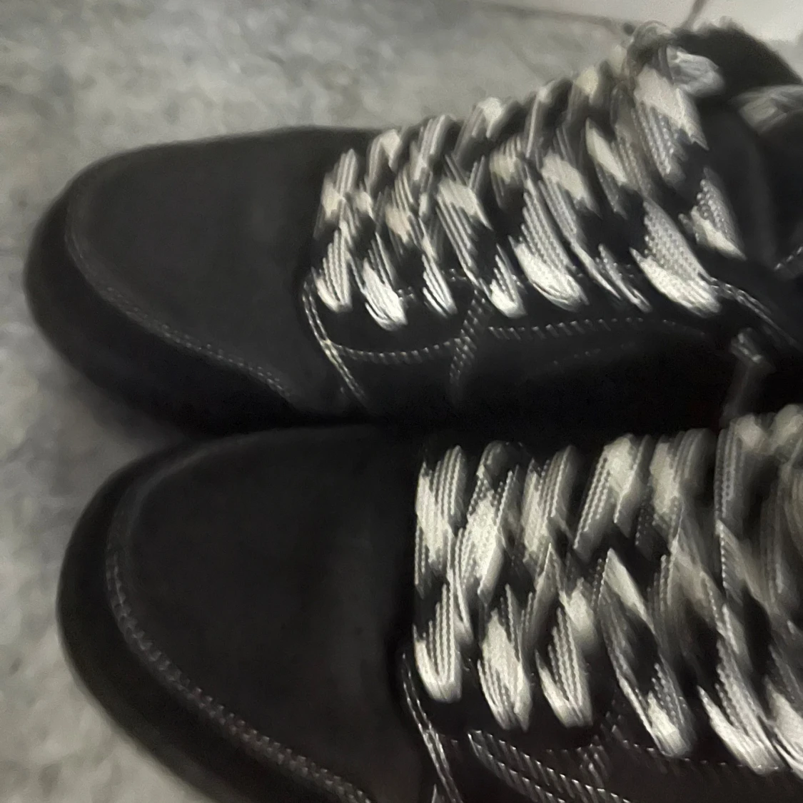 Säljer ett par svarta Nike Jordan 1 Low med tydliga vita kontrastsömmar och coola svartvita snören. Skorna har en klassisk siluett, rund tå och är gjorda i mocka med detaljer i skinn. Perfekta för dig som vill sticka ut med en unik sneaker.