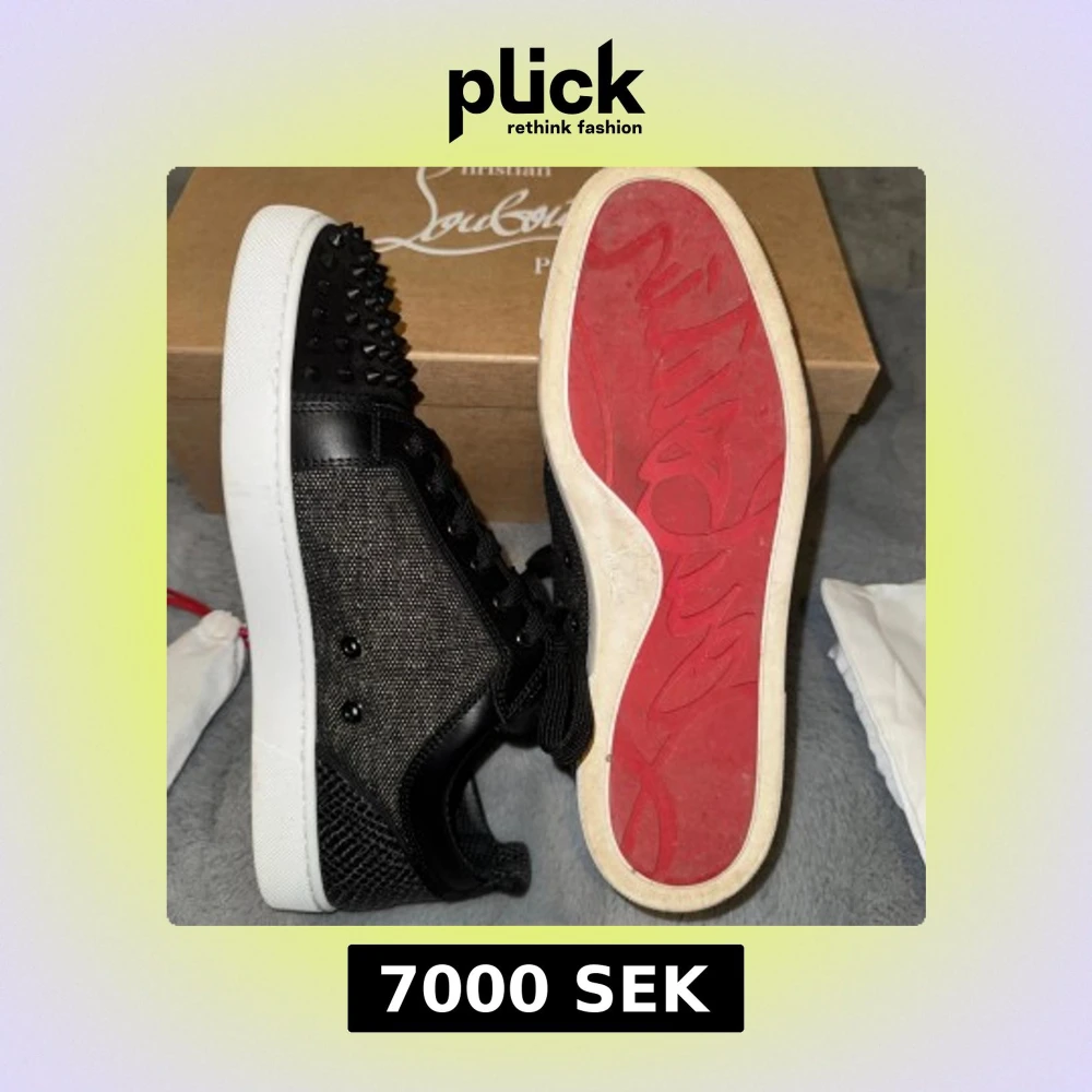Snygga svarta sneakers från Christian Louboutin med ikoniska röda sulor. Skorna har nitar på tån och är tillverkade i en kombination av skinn och textil. Perfekta för att ge en edgy touch till din stil. Köpta 2024 men opererat foten så de har inte kommit till användning, är i nyskick och nästan aldrig använda, nypris 9700kr