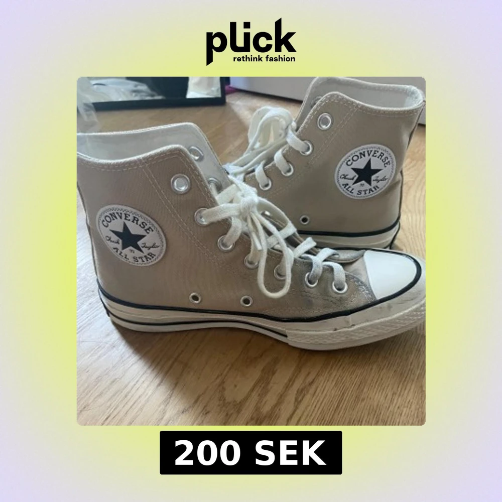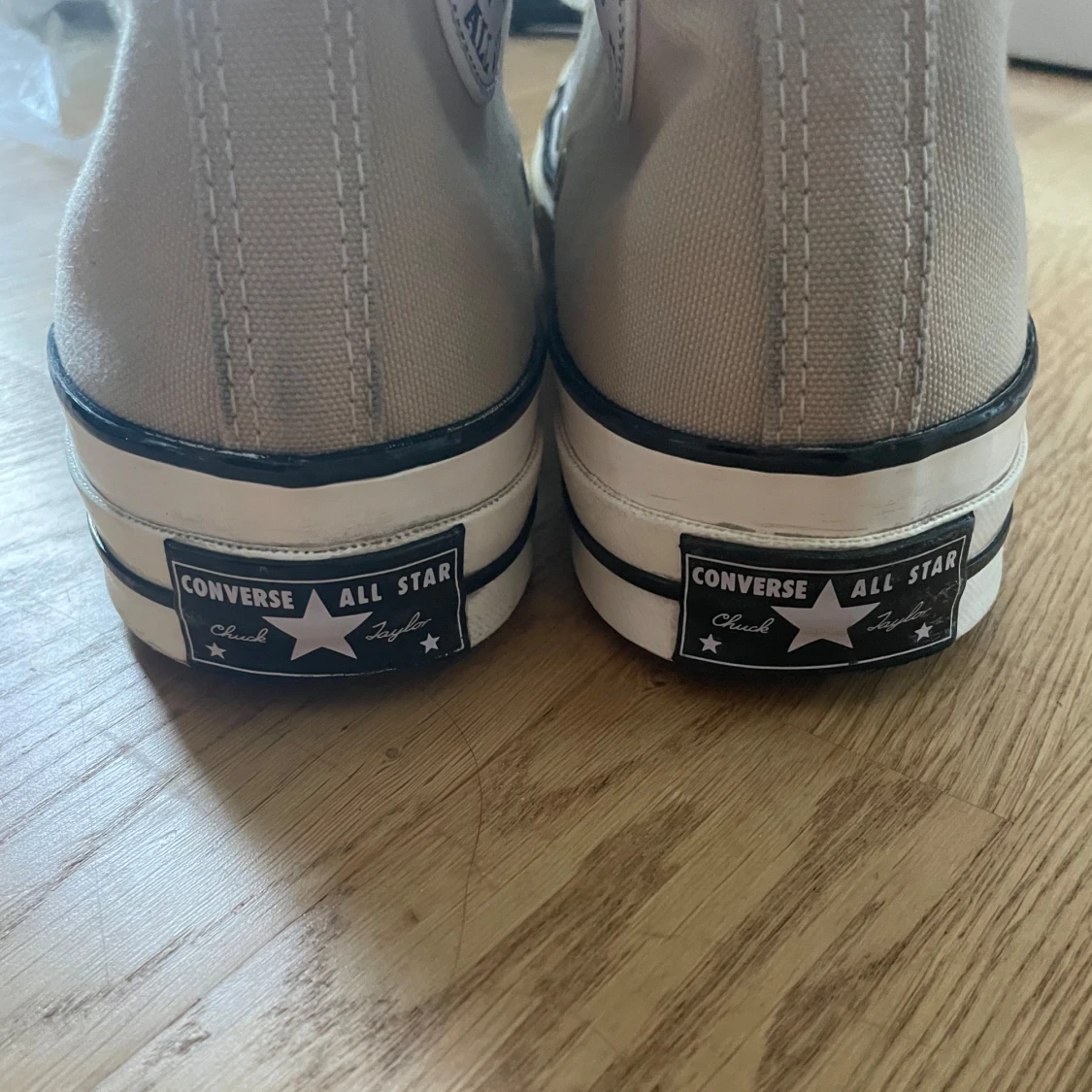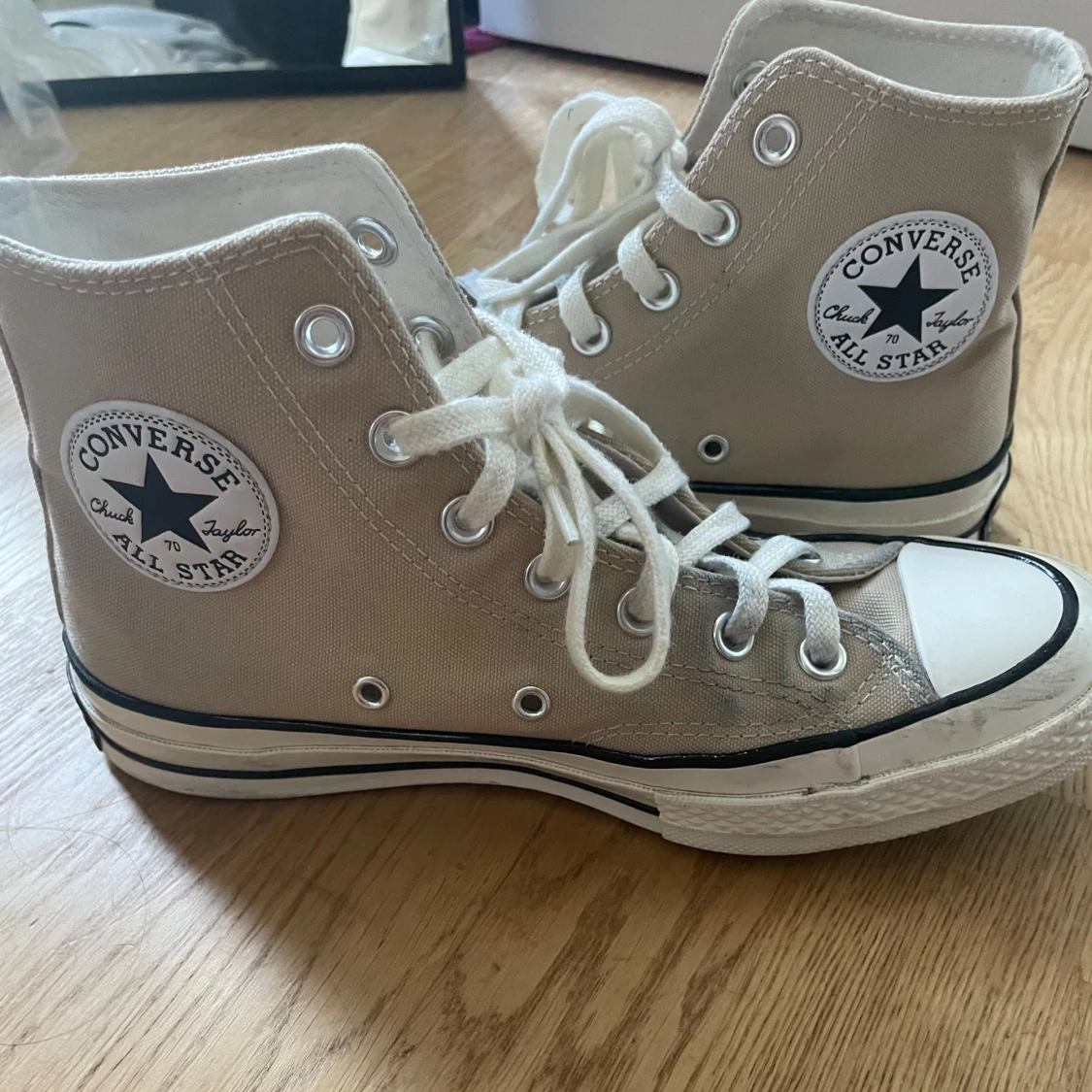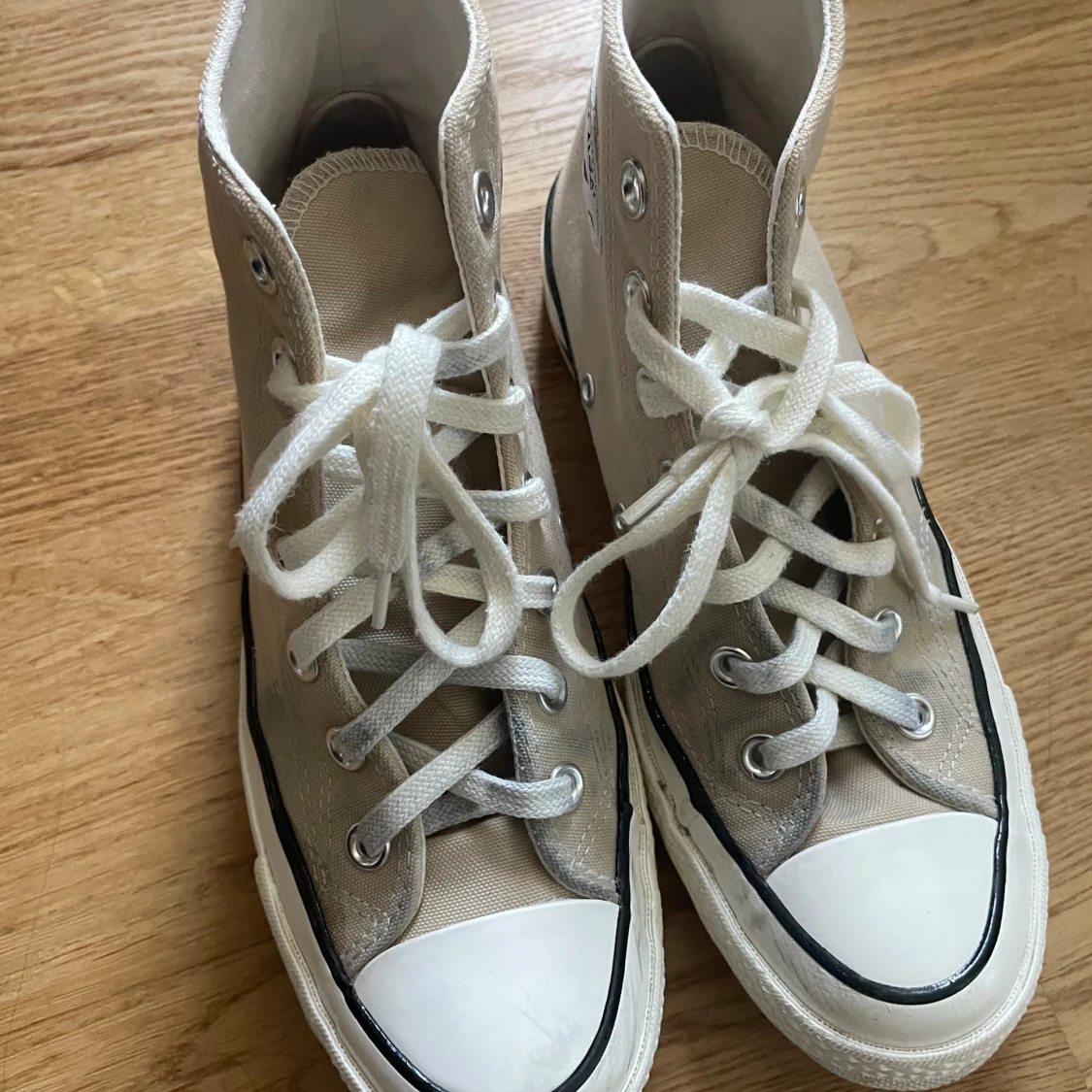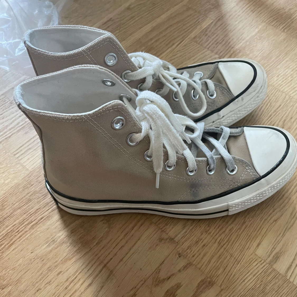 Beige Converse skor köpta förra året så de är i bra skick fast de har några fläckar på sig.