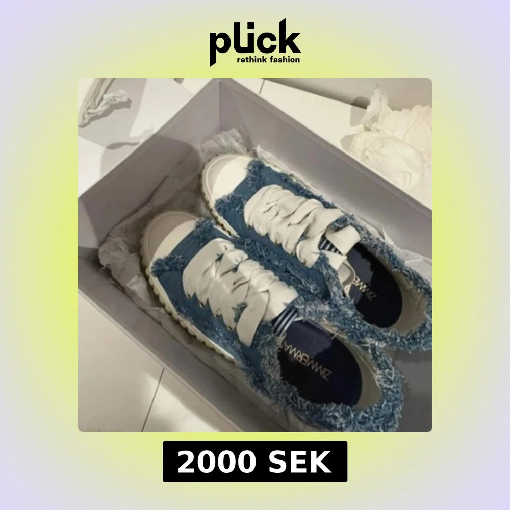 Unika sneakers från Zimmermann i ljusblå denim med fransade kanter och breda vita snören. Skorna har en chunky, räfflad sula i beige och coola detaljer som ger en avslappnad streetstyle-vibe. Perfekta för dig som gillar statement-skor och denim. Box medföljer och har även bild på kvitto och orderbekräftelse.