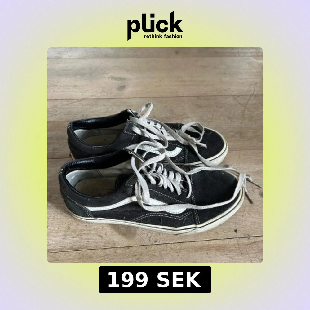 Klassiska svarta och vita Vans sneakers med vit sula och vit sidestripe. Skorna har snörning och en platt gummisula med det karakteristiska rutmönstret undertill. Perfekta för en avslappnad streetstil.