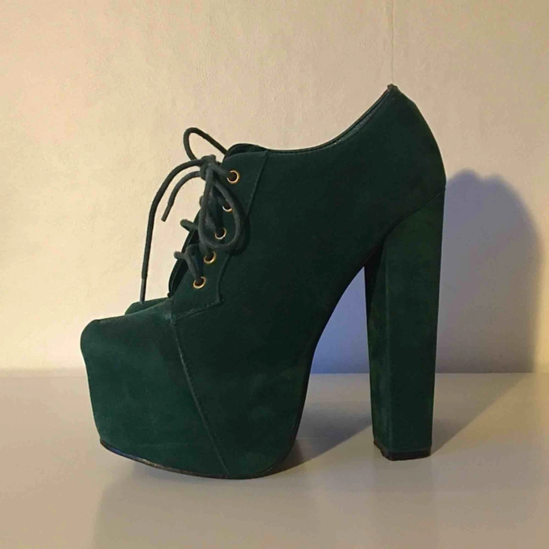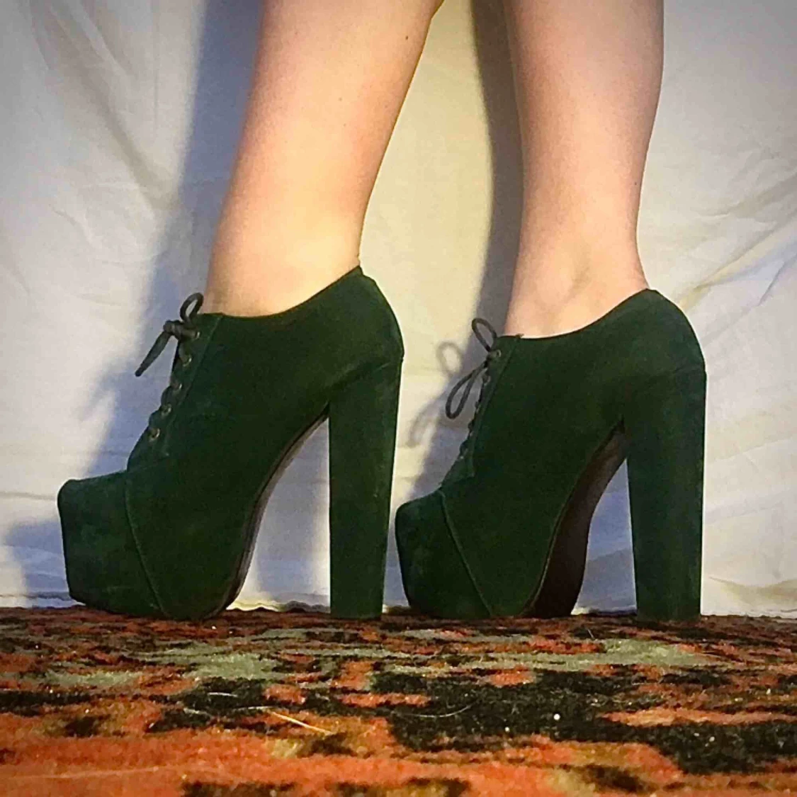 Unika gröna boots med hög klack! Endast använda inomhus och i väldigt bra skick. Står storlek 39 på, men skulle säga att det mer är 38