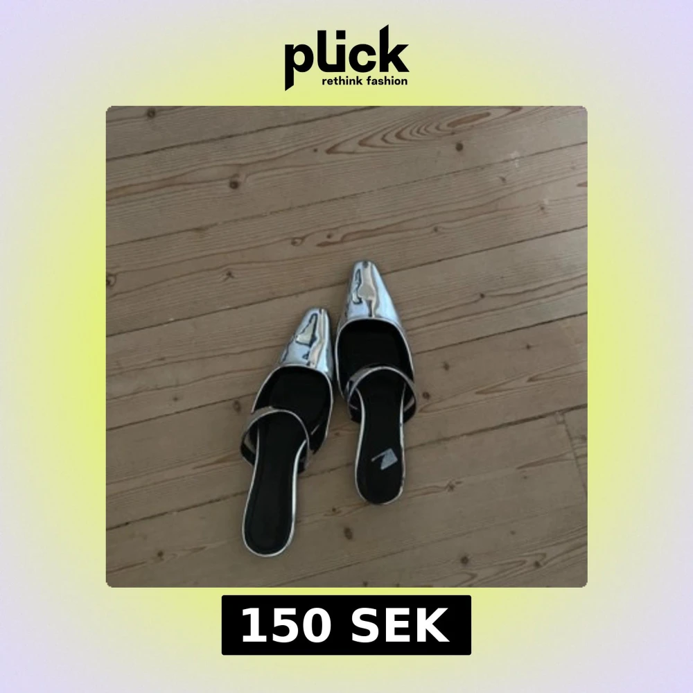 Säljer ett par riktigt snygga ballerinaskor i metallic silver med spetsig tå och platt sula. Skorna har öppen häl och en bred rem över foten. Perfekta för dig som vill sticka ut med en futuristisk vibe och gillar att mixa material och former.