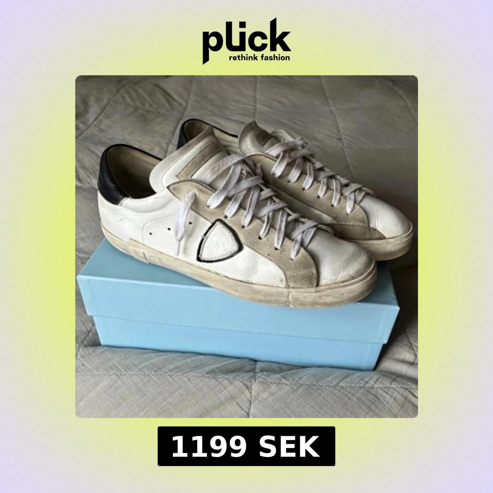 Säljer ett par Philippe Model PRSX Low i storlek 45. Skorna är väl använda men fortfarande i bra och fullt användbart skick, utan större slitningar eller skador. Modellen är känd för sin exklusiva kvalitet, handgjorda detaljer och den ikoniska sköld-loggan på sidan. Färg i vitt med svarta detaljer – stilrent och tidlöst. Originalkartong ingår, vilket syns på bilderna. Nypris ligger runt 3 500 kr, men varierar beroende på butik. Pris kan diskuteras!