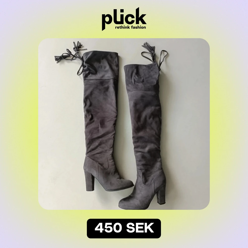 Snygga grå stövlar i mocka med hög klack och dragkedja på sidan. De har en elegant spetsig tå och knytning upptill för extra stil. Perfekta för höst och vinter, både till vardags och fest.