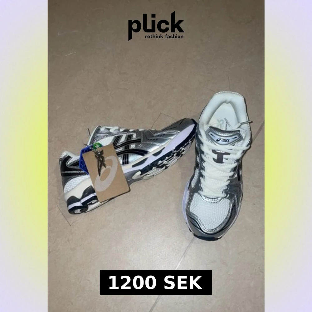 Säljer ett par snygga ASICS sneakers i silver, vitt och svart med coola detaljer. Skorna har mesh-överdel för bra ventilation, silvriga paneler och klassisk snörning. Sulan är vit med svarta inslag och har en sportig design som sticker ut. Perfekta för dig som gillar retrostil och komfort.