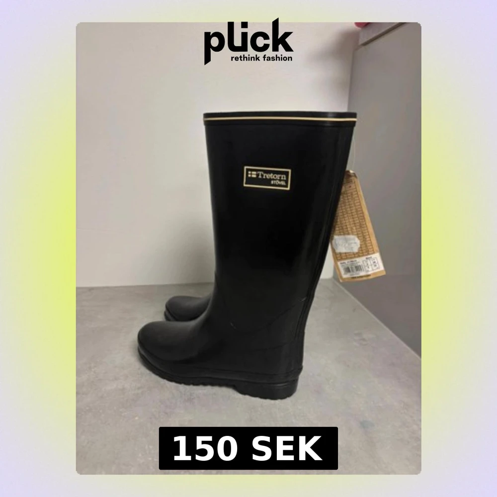 Svarta höga stövlar från Tretorn med klassisk rund tå och platt sula. Tillverkade i slitstark syntet med diskret gulddetalj upptill. Perfekta för regniga dagar och har en stilren look som funkar till många outfits. Ny med prislapp ord pris 599kr