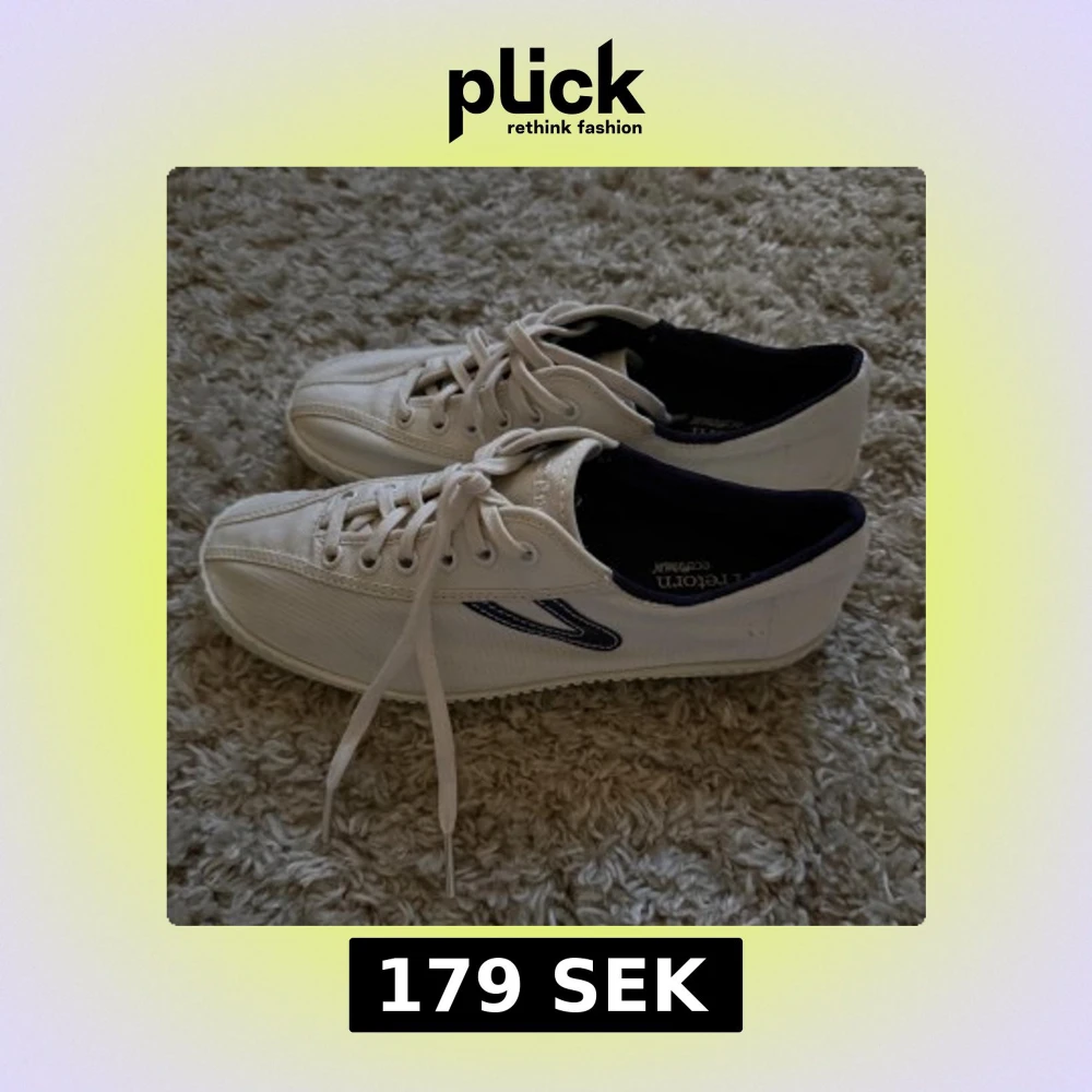 Säljer ett par klassiska vita sneakers från Tretorn med marinblå detaljer och snörning. Skorna är i canvasmaterial och har en platt sula samt rund tå. Perfekta för en clean och stilren look.