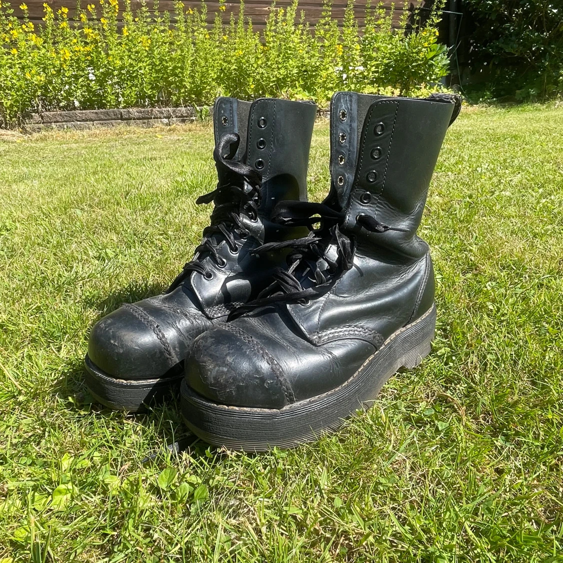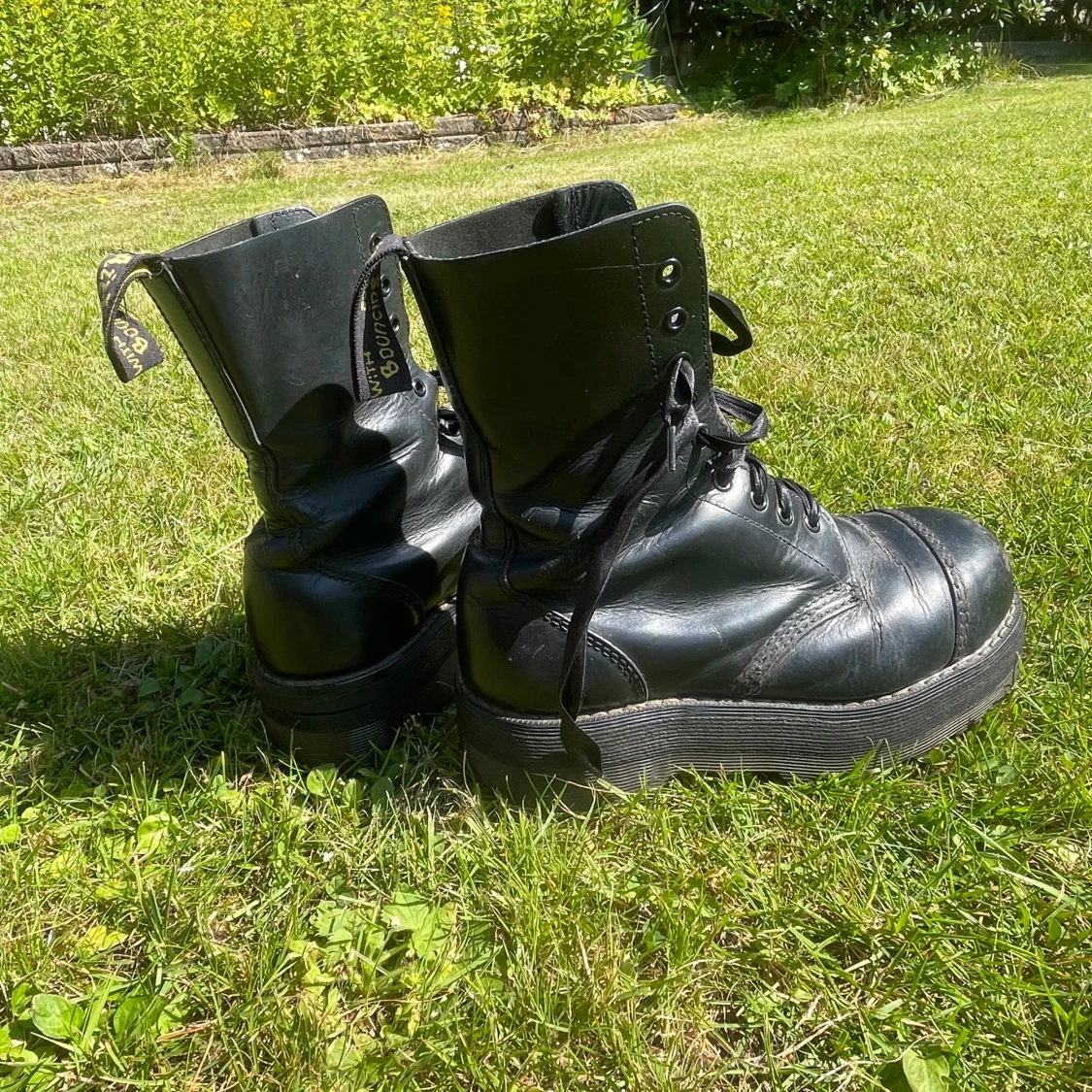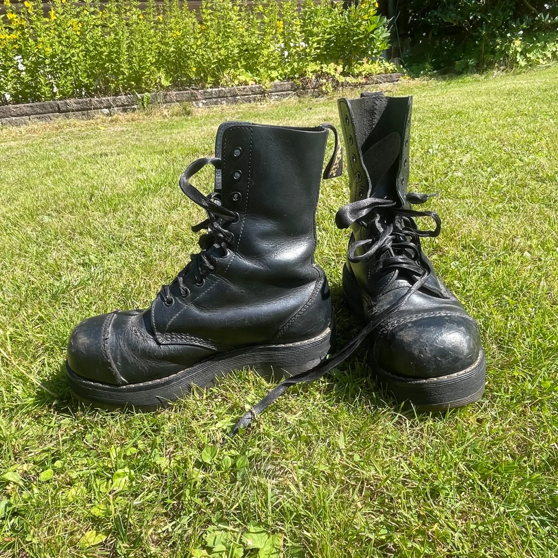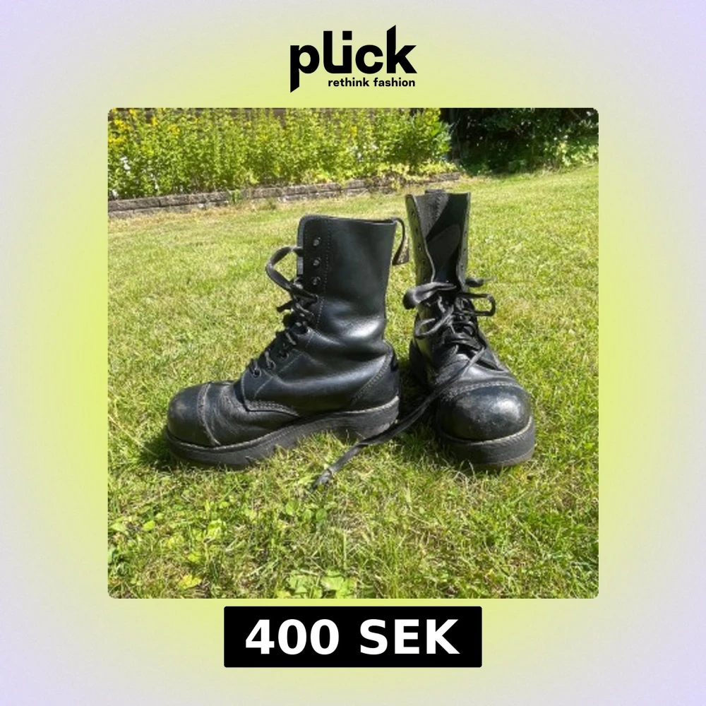 Säljer ett par robusta svarta dr martens kängor, tillverkade i England. De har en kraftig sula och snörning framtill. Väll använda men sulan är suprisingly inte så ner slipad. Men sulan i är väll använd. Storleken är oklar men skulle tro 37. Skorna är gjorde nån gång under 1995-2003