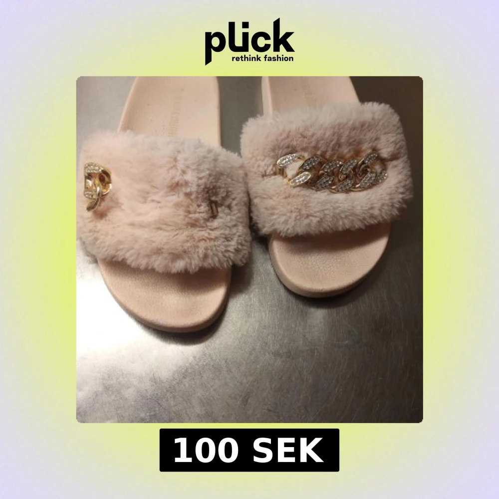 Snygga ljusrosa tofflor med päls och glittrande gulddetaljer. Perfekta för en lyxig och bekväm stil. Sandalerna har en bred rem över foten med en dekorativ kedja och en liten gulddetalj på sidan, pga att den har gått sönder.