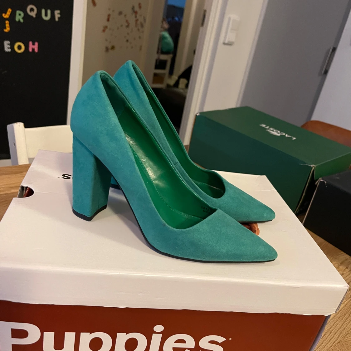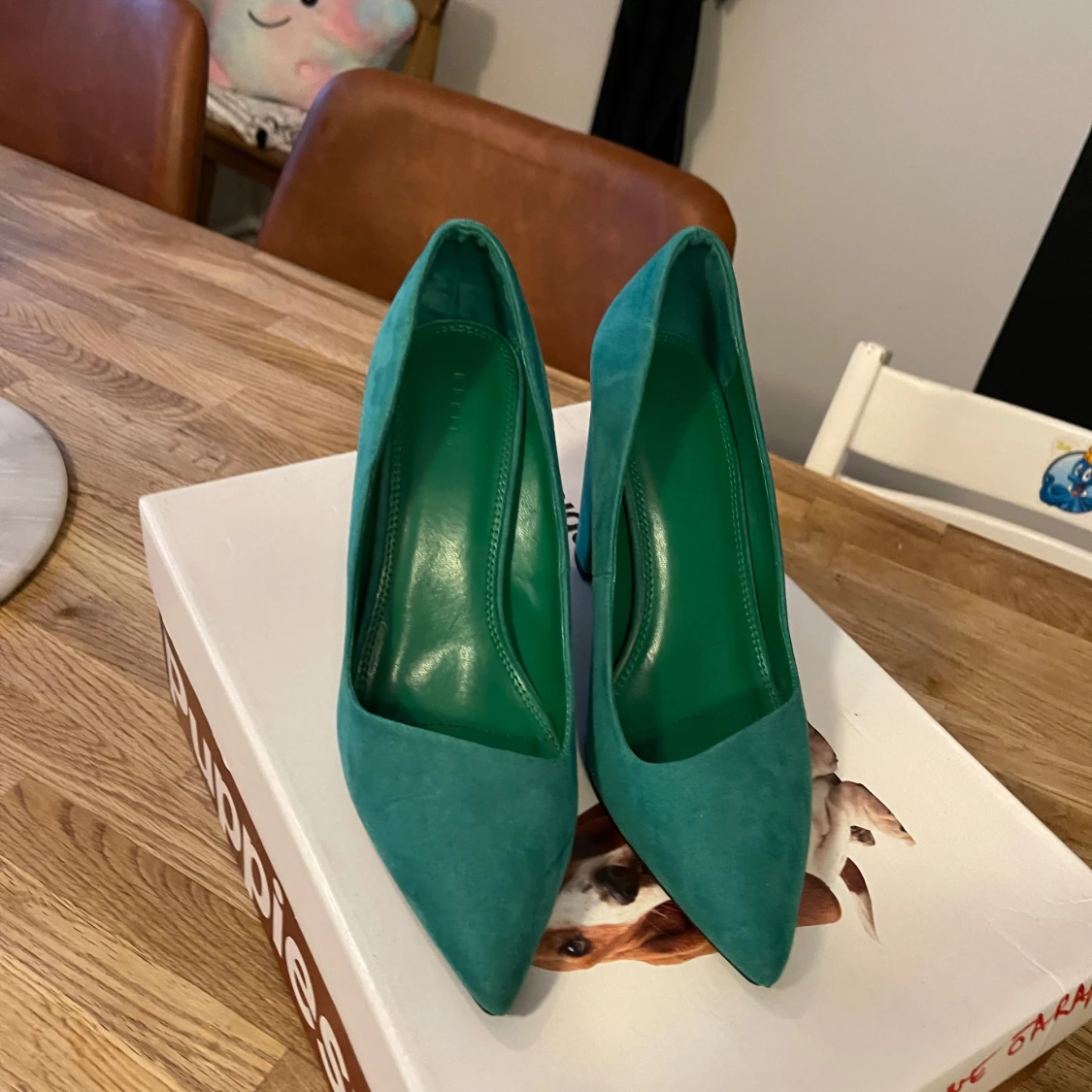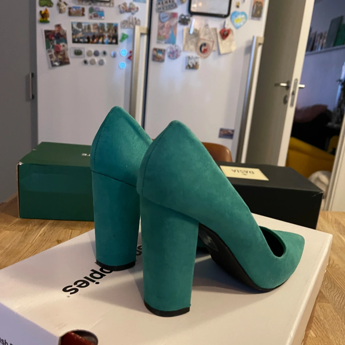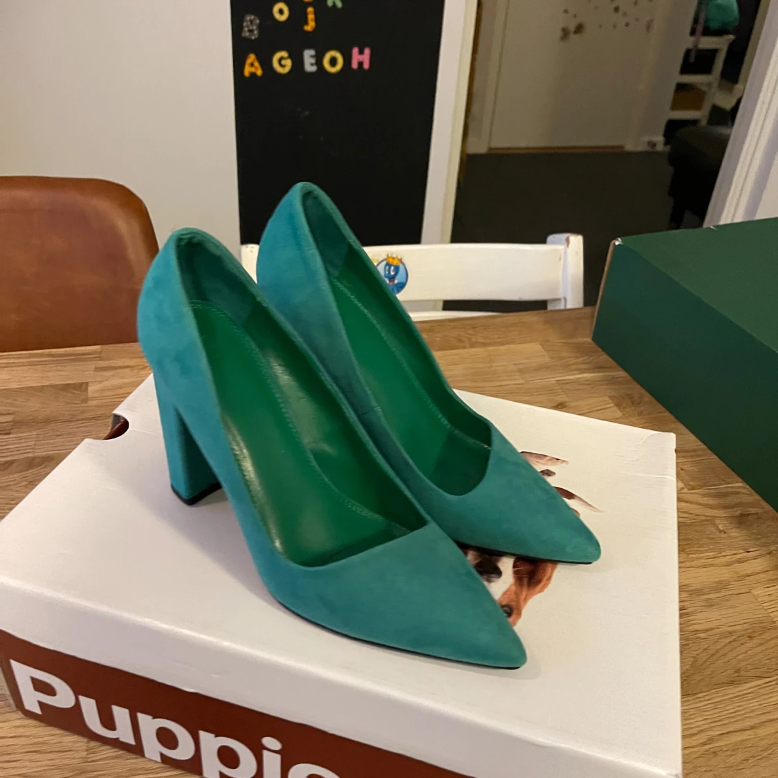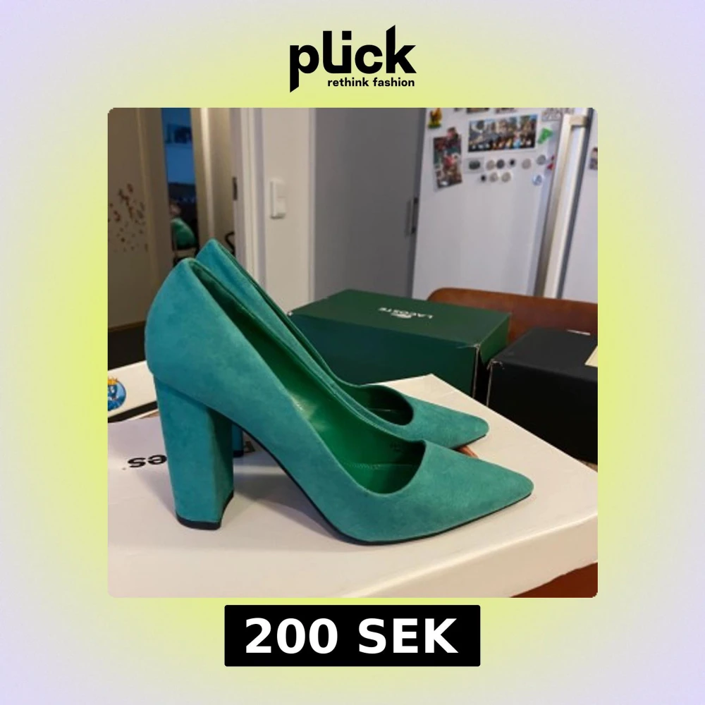 Snygga turkosa pumps med en stabil blockklack och spetsig tå. Perfekta för att ge en färgklick till din outfit. Tillverkade i ett mjukt material som ger en lyxig känsla.Använda bara en gång