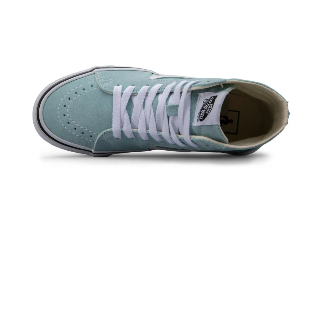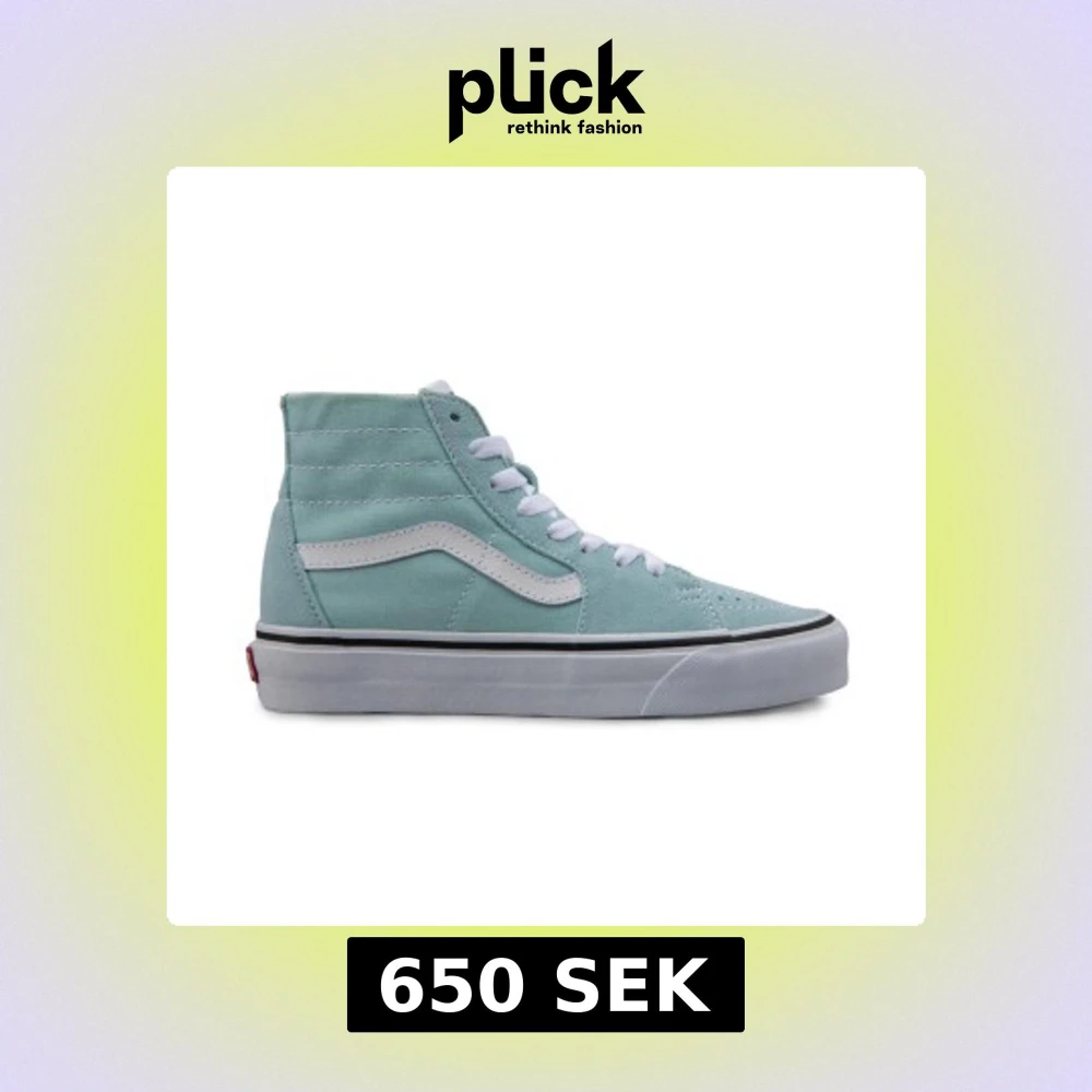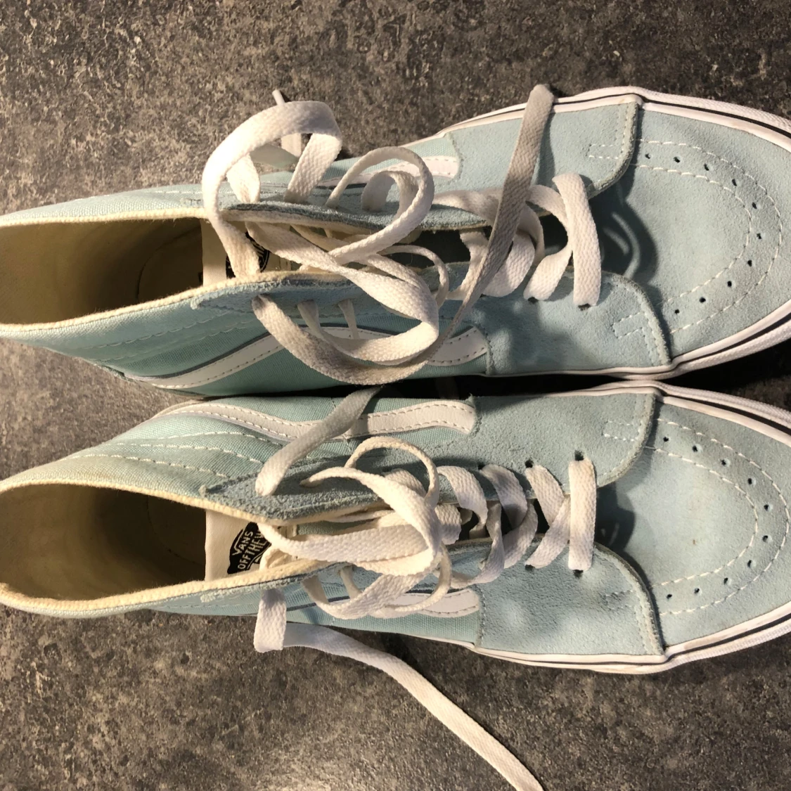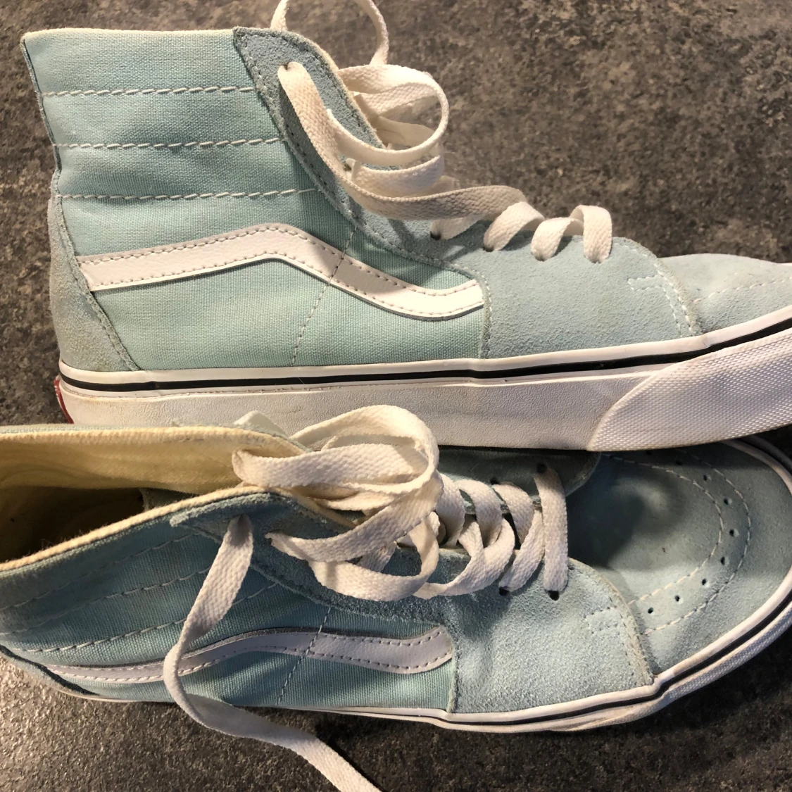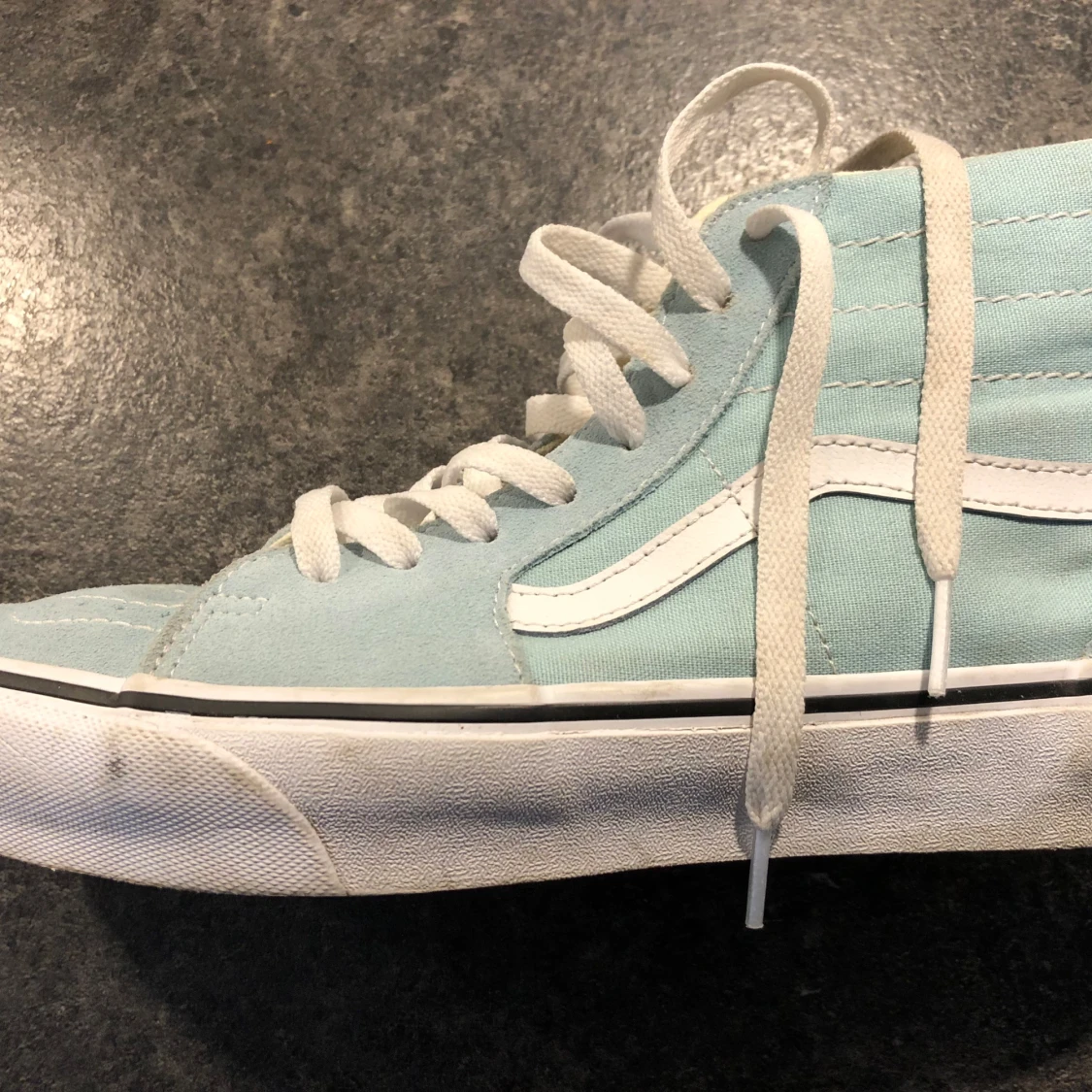 Säljer ett par Vans sneakers i mintgrön färg med vit sidorand och vita snören. Skorna har hög modell, rund tå och platt sula. Ovandelen är i mocka