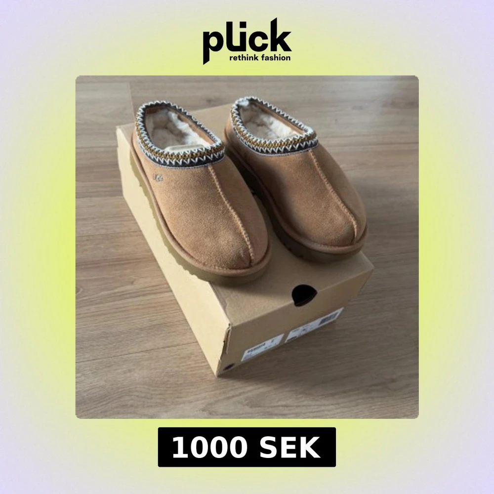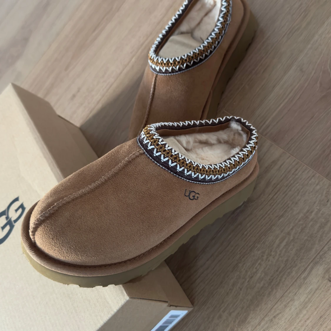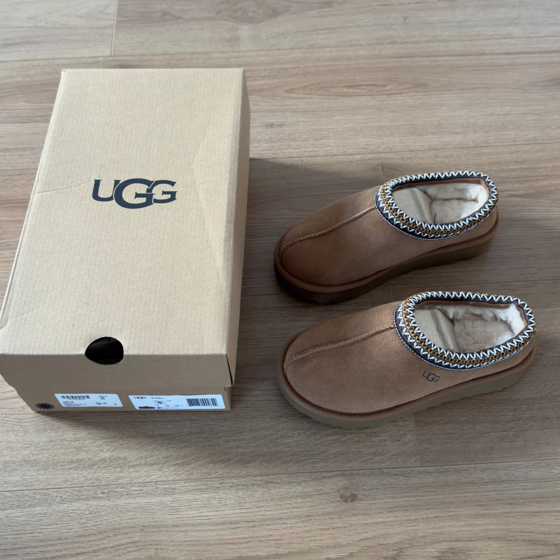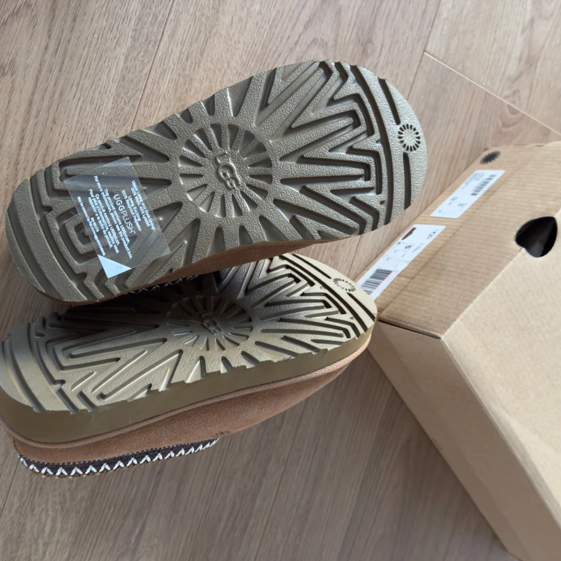 Mysiga bruna slip-on skor från UGG med mjukt foder och dekorativt mönster runt öppningen. Skorna har en kraftig sula och är perfekta för kalla dagar. Klassisk UGG-logga på sidan och ovandel i mocka. HELT NYA!
