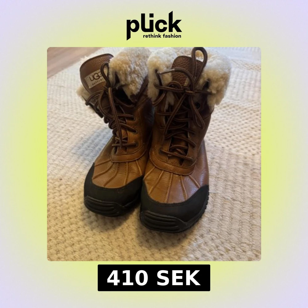 Säljer ett par bruna vinterboots från UGG med snörning, svart gummisula och mjukt fårskinnsfoder. Skorna är i skinn och har en robust, räfflad sula för bra grepp. Perfekta för kalla dagar och riktigt snygga till vinterlooken.