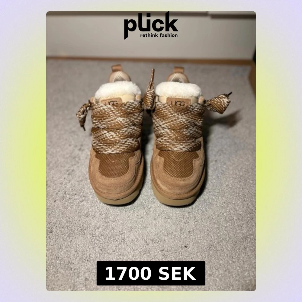 Säljer ett par snygga UGG sneakers i beige mocka och mesh med fluffigt vitt ullfoder. Skorna har grova, mönstrade snören i beige och vitt samt en rejäl sula för bra grepp. Perfekta för kalla dagar och riktigt sköna att ha på sig.