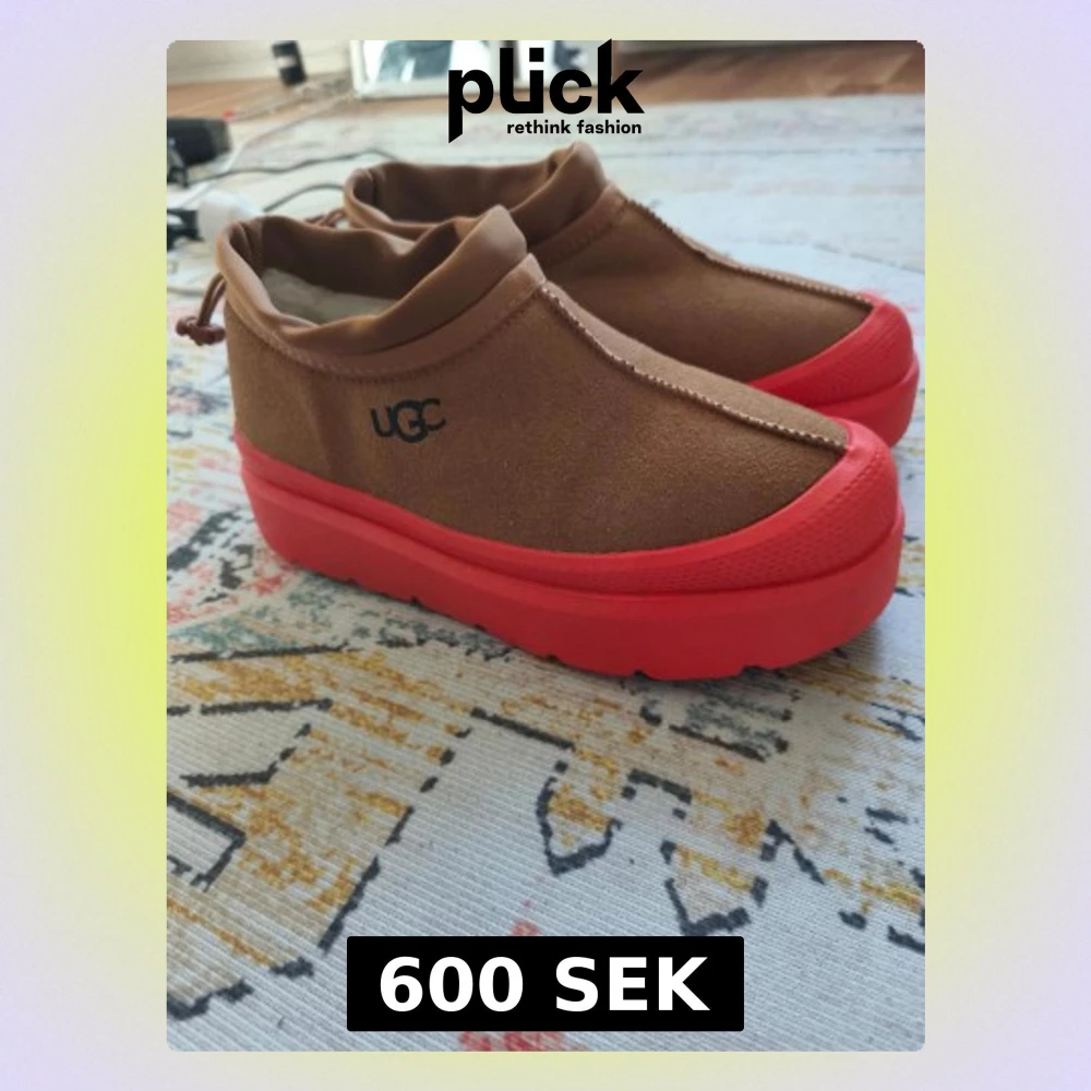 Säljer ett par bruna UGG boots med chunky, klarröd platt sula. Ovandelen är i mocka och insidan är fodrad med mjukt material. Skorna har rund tå och dragsko bak för enkel justering. Perfekta för dig som vill sticka ut med färg och komfort.