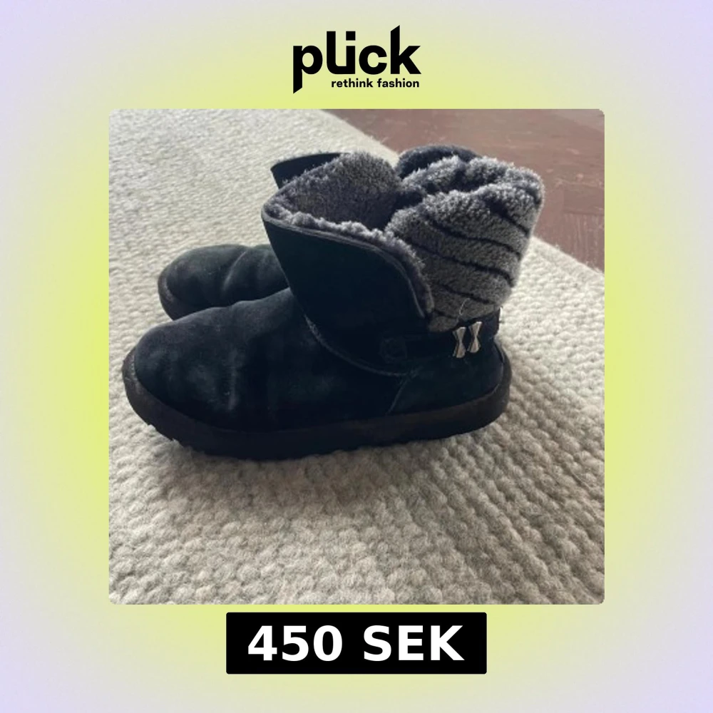 Mysiga svarta äkta UGG boots med grått pälsfoder och grov sula. Skorna har rund tå, platt sula och dekorativa metallspännen på sidan. Utsidan är i mjuk mocka och insidan är fodrad med fluffigt syntetpäls för extra värme. Perfekta för kalla dagar. De är i ok skick.
