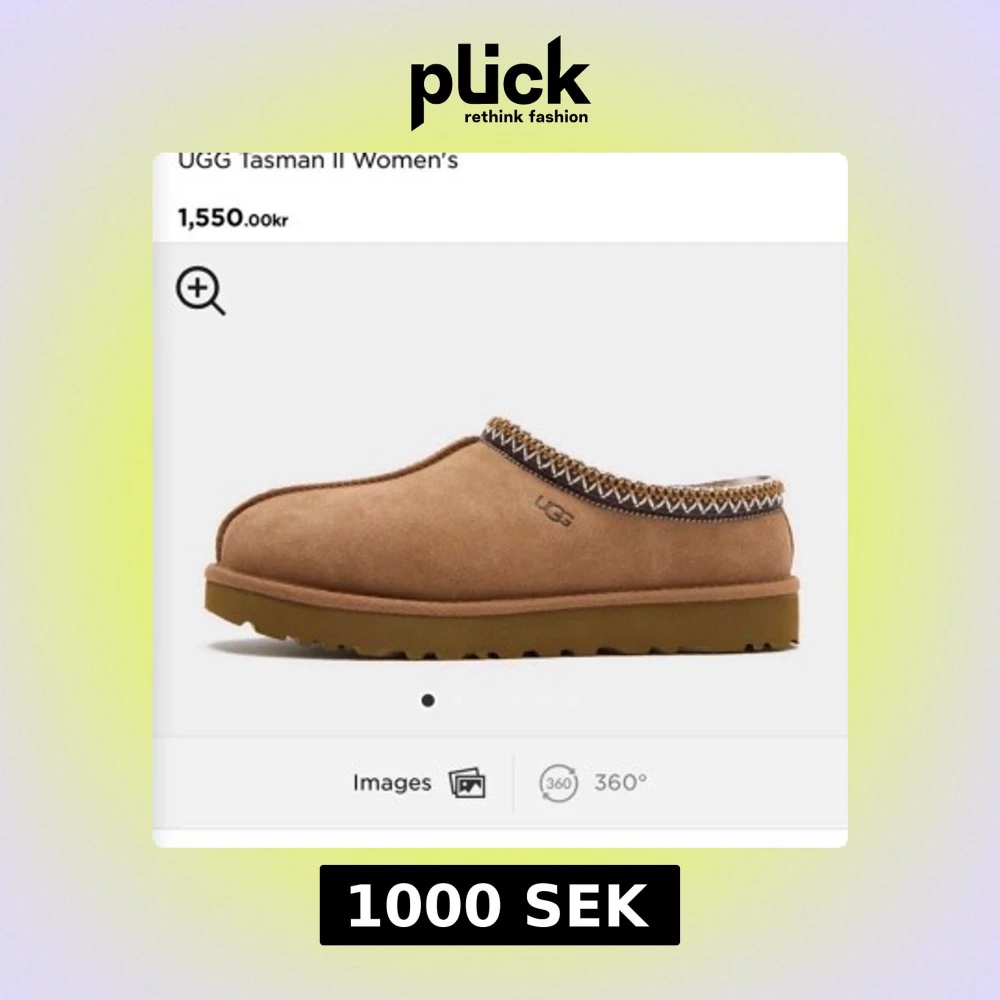UGG Tasman II slip-on i brun mocka med broderad kant i beige och vitt. Skon har en platt sula med grovt mönster och rund tå. Perfekt för chill dagar och har UGG-loggan på sidan. Fodrad insida för extra komfort. Oanvända och som i nytt skick.