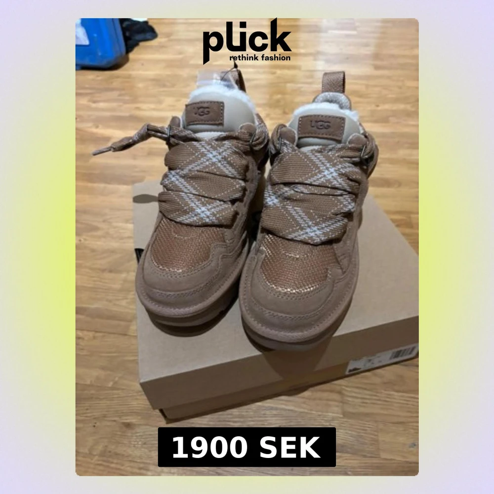 Bruna UGG Lowmel sneakers i storlek 38 med breda snören i rutigt mönster och fluffig vit insida i päls. Ovandelen är i mocka och textil, och skon har en chunky, platt sula. Perfekta för dig som vill ha både stil och komfort.