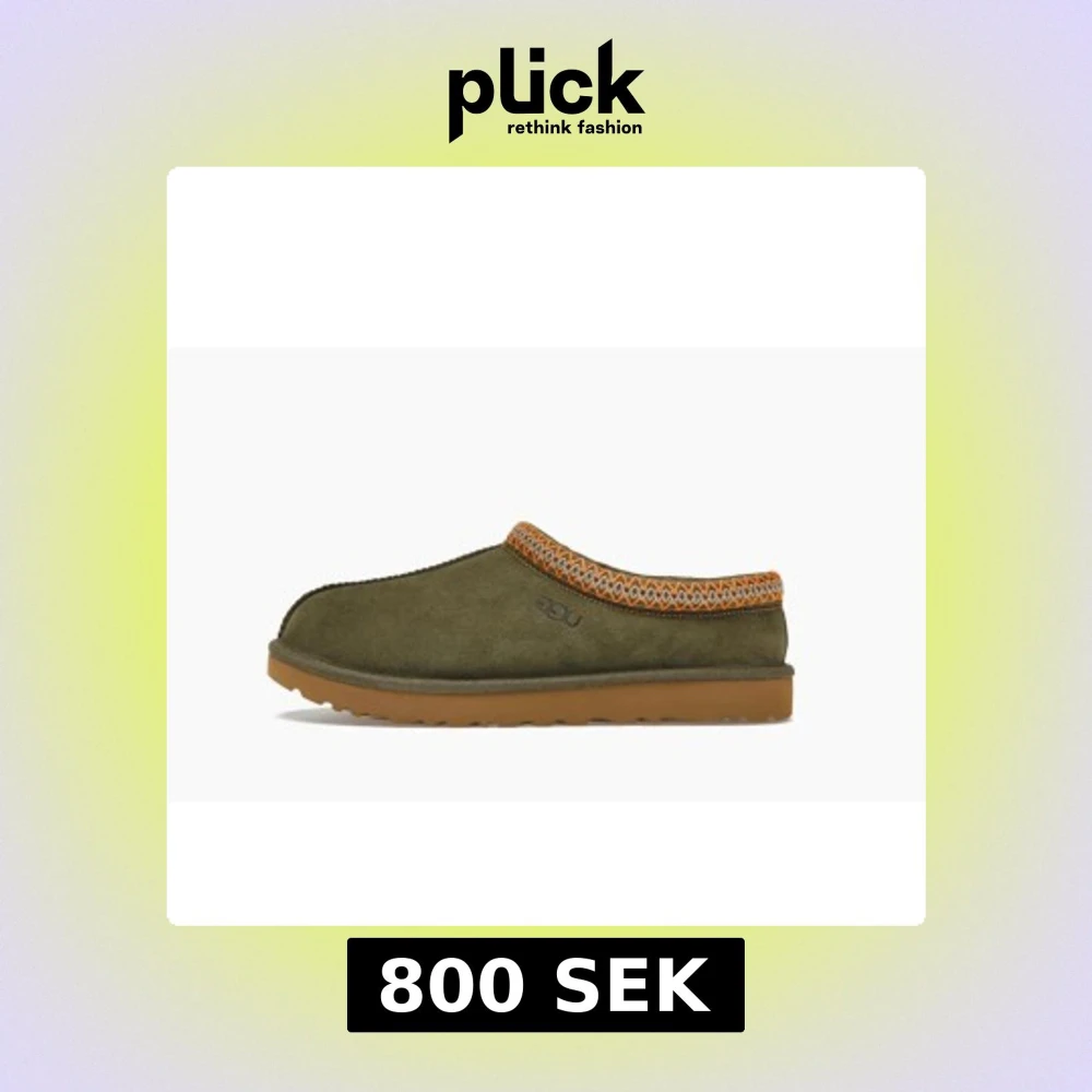 Säljer ett par olivgröna slip-on Ugg Tasman med snyggt mönstrad kant i orange och vitt. Skorna har rund tå, platt sula och är tillverkade i mjuk mocka med broderad UGG-logga på sidan. Perfekta för chill dagar hemma eller när du vill vara extra bekväm.