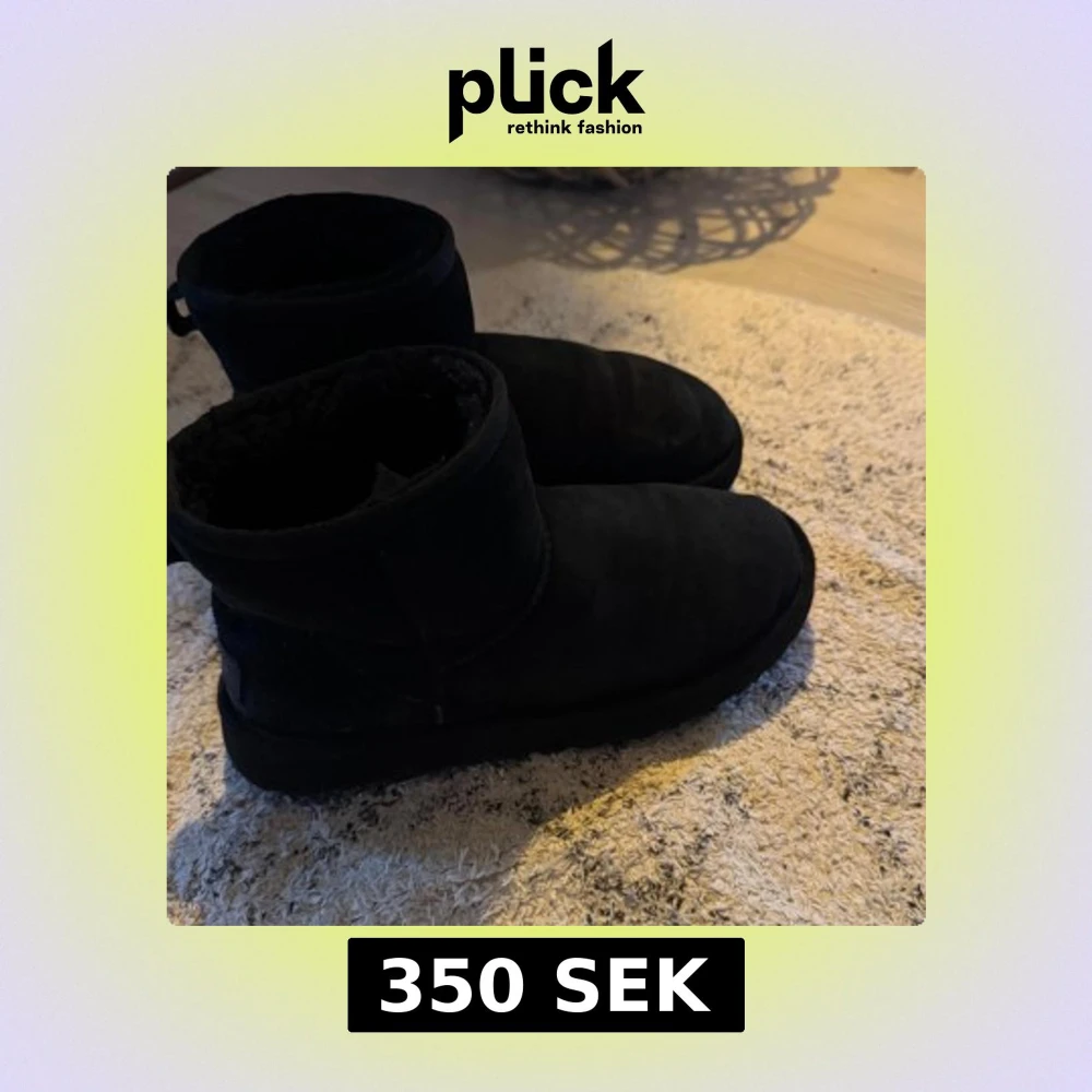 Säljer ett par svarta UGG’s med rund tå och platt sula. De är tillverkade i mjuk mocka och har ett fluffigt foder på insidan som gör dem extra sköna och varma. Perfekta för kyliga dagar och har en enkel, stilren design.
