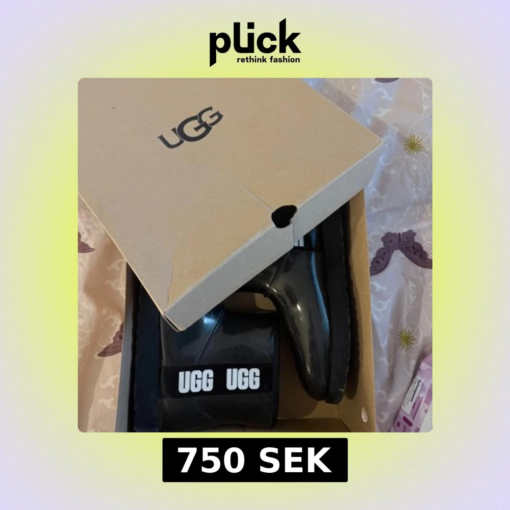 Säljer ett par svarta UGG boots i glansigt syntetmaterial med tydlig vit UGG-logga på sidan och bak. Skorna har platt sula och rund tå, perfekt för dig som vill ha en cool och trendig look under höst och vinter. Storlek 39 men passar även 38, nypris 1999kr
