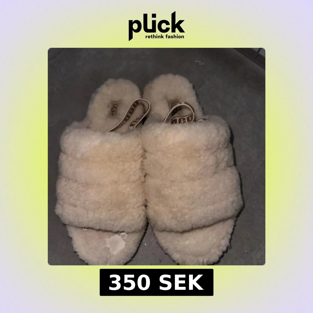 Supermysiga sandaler från UGG i beige fårskinn med breda remmar och elastiskt band med UGG-logga. Sulan är i gummi med mönster för bra grepp. Perfekta för att chilla hemma eller när du vill ha något extra cozy på fötterna. De är lite slitna vid ena tån vilket syns på bilden