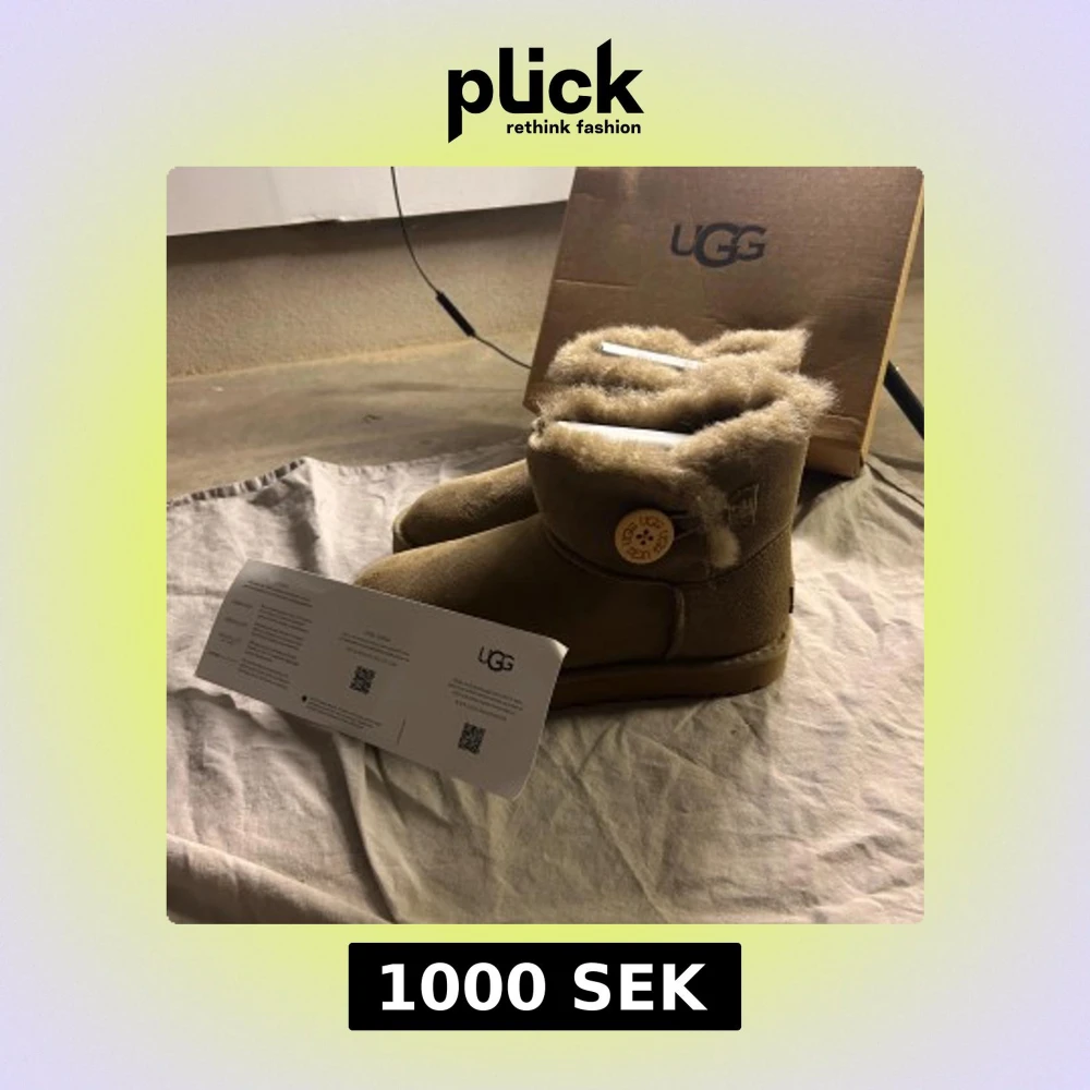 Säljer ett par klassiska UGG boots i beige mocka med fluffigt pälsfoder och rund tå. Skorna har en dekorativ knapp med UGG-logga på sidan och platt sula. Perfekta för kalla dagar och riktigt sköna att dra på sig när man vill vara varm om fötterna.