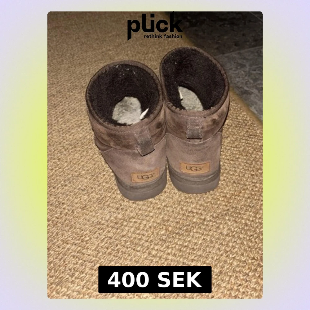 Mysiga bruna UGG boots med rund tå och platt sula. Utsidan är i mjuk mocka och insidan är fodrad med mörkt fluffigt material som håller fötterna varma.