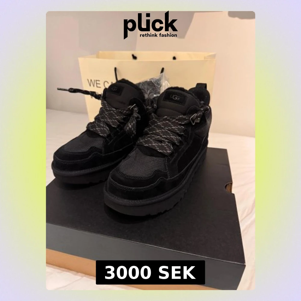 Säljer ett par svarta UGG sneakers med grov platt sula och rund tå. Skorna har snygga mönstrade snören och är tillverkade i en mix av mocka och syntetmaterial. Insidan är fodrad för extra komfort och värme, perfekt för dig som gillar streetstyle. Har kvitto går knappt att få tag på