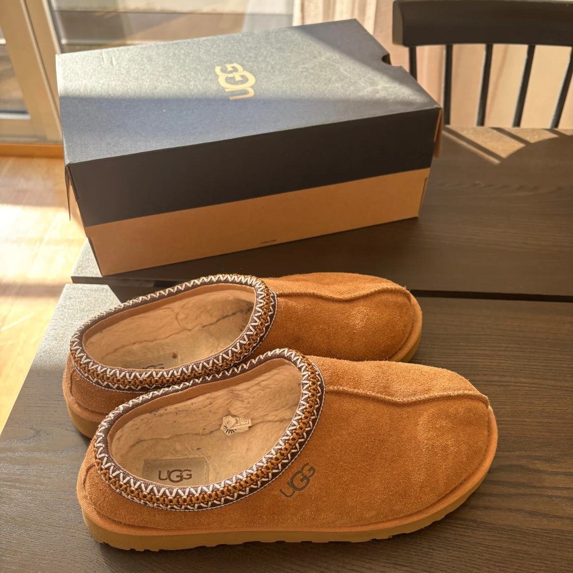Säljer ett par bruna slip-on skor från UGG i mjuk mocka med fluffigt foder och grov sula. Skorna har dekorativt mönster runt öppningen och är perfekta för chill dagar. Skorna är varsamt använda nästintill nyskick utan några defekter. Pris kan diskuteras!