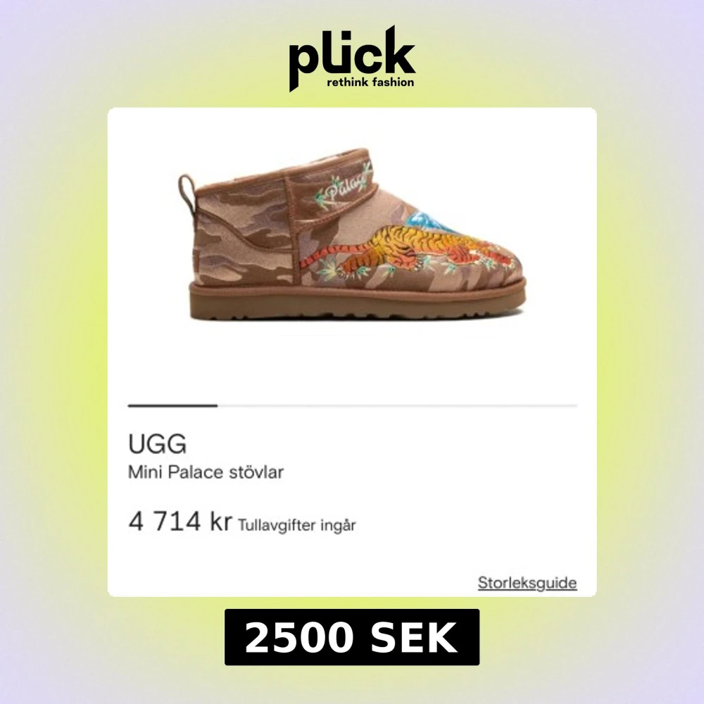 Bruna UGG Mini Palace stövlar med broderad tiger och blått motiv på ovandelen. Skorna har camouflage-mönster och är tillverkade i mocka med platt sula och rund tå. Perfekt för dig som vill sticka ut med unika detaljer. Box medföljer samt dustbag. Har exakt likadana i mörkblå färg, pris går att diskutera.