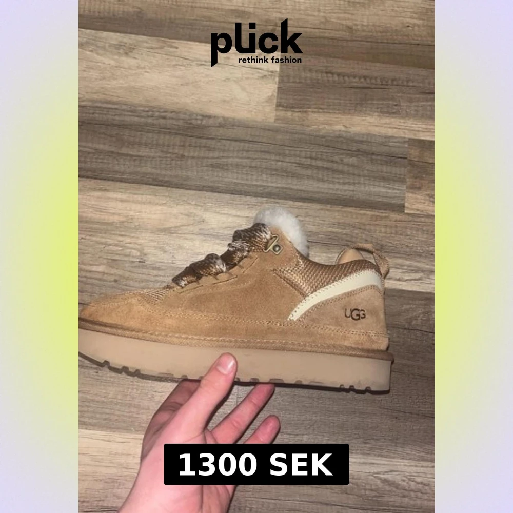 Säljer ett par snygga UGG sneakers i beige mocka med stickade detaljer och fluffig vit fårull på insidan. Skorna har grova snören, platt sula och UGG-logga på sidan. Perfekta för höst och vinter när du vill hålla stilen och värmen. storleken passar både 44-45. Pris kan diskuteras vid snabb affär.