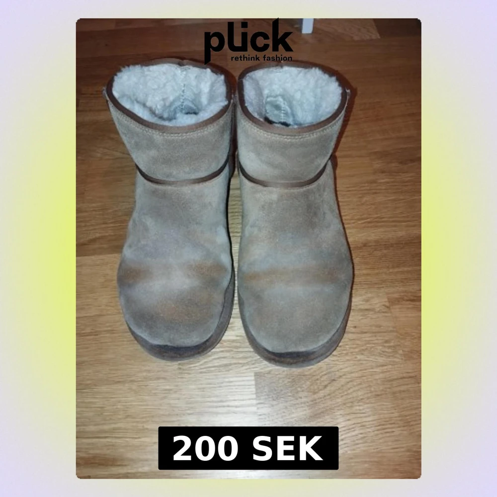 Säljer ett par klassiska UGG boots i brun mocka med mjukt vitt fårskinnsfoder. Skorna har rund tå, platt sula och UGG-logga bak på hälen. Perfekta för kalla dagar och riktigt mysiga att ha på sig.
