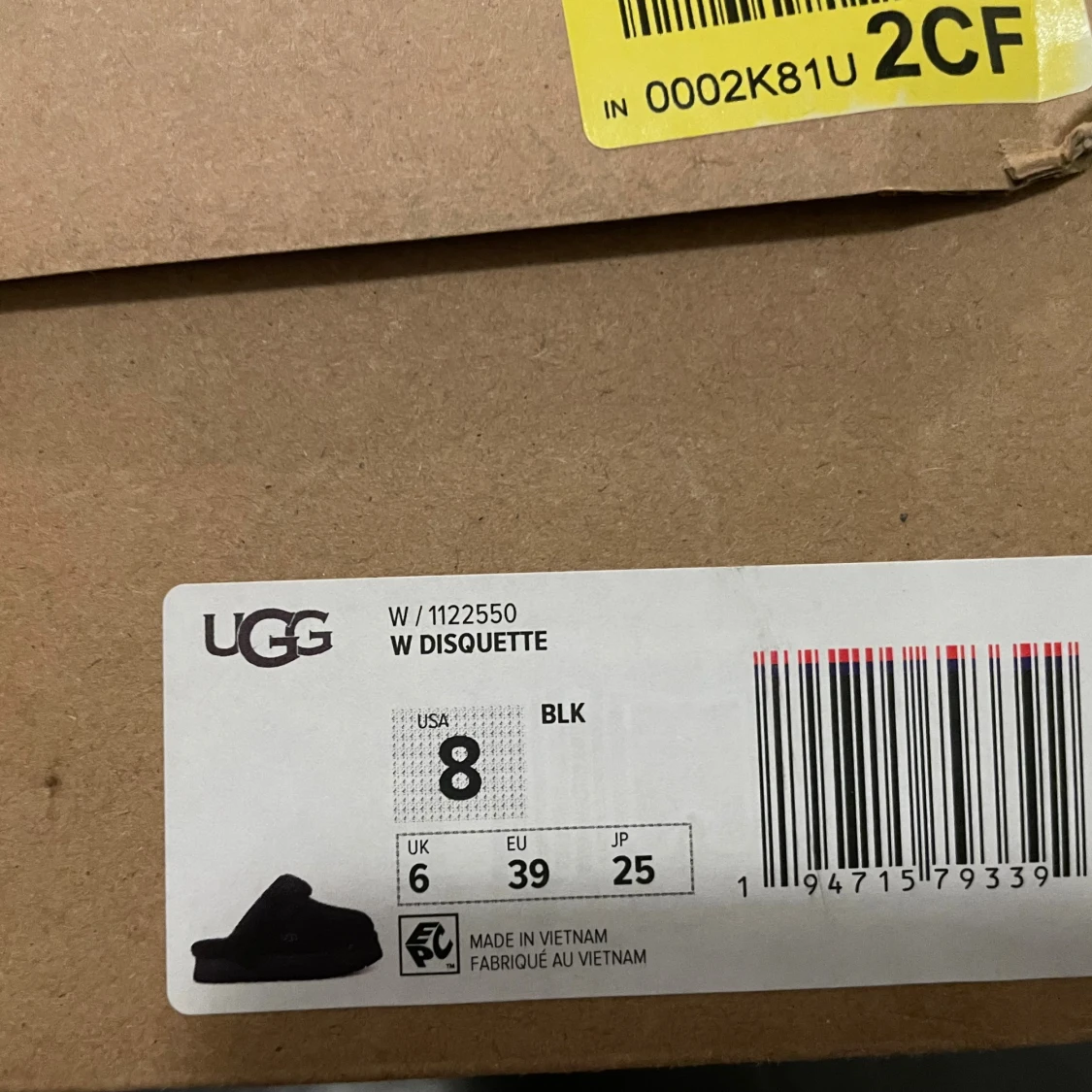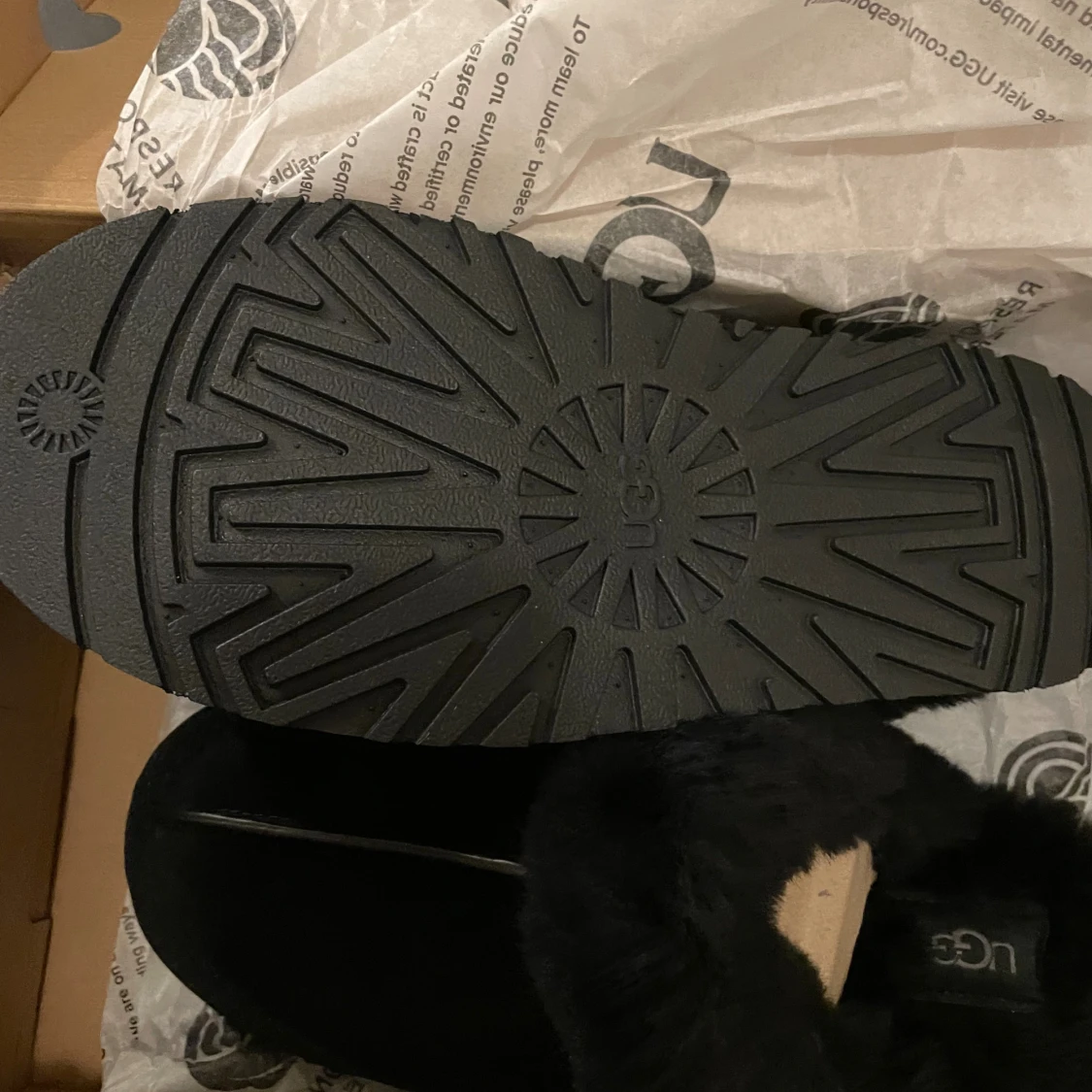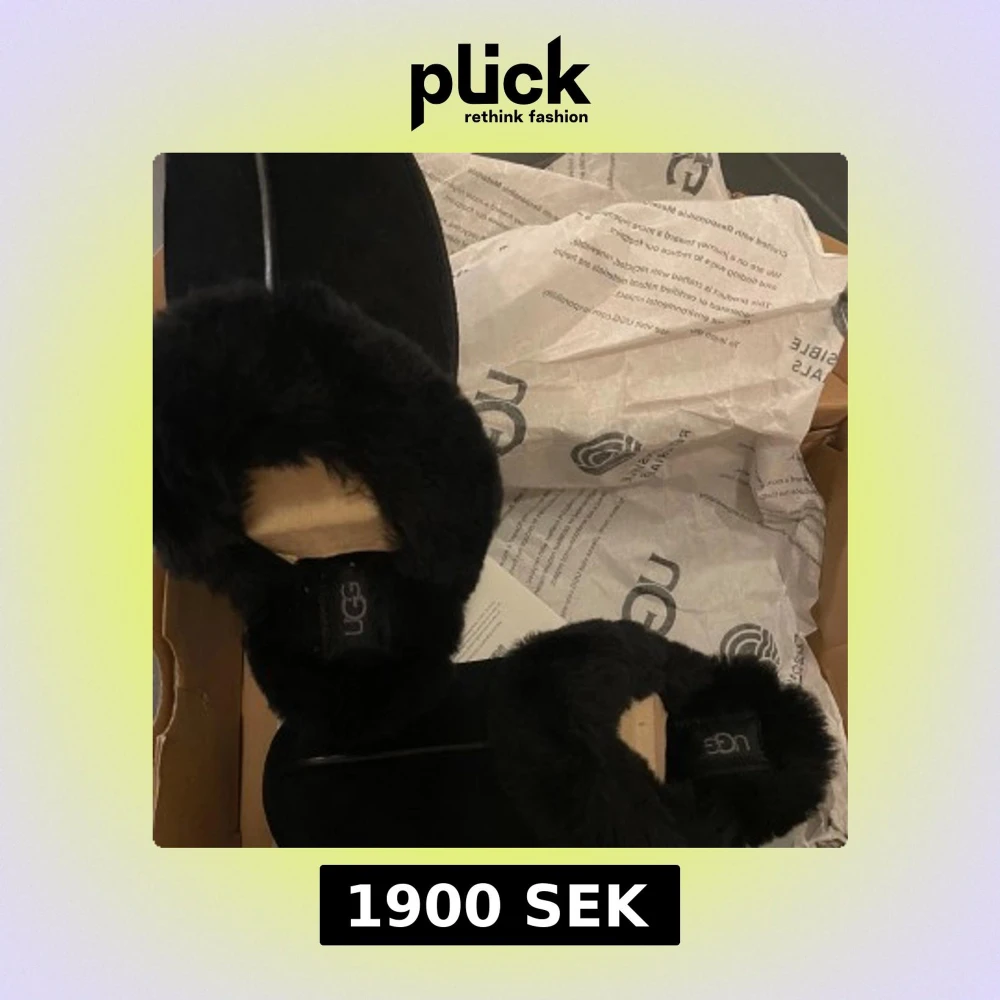 Mysiga svarta UGG Disquette tofflor med fluffig päls runt öppningen och ovandel i mocka. Sulan är rejäl och mönstrad för bra grepp. Perfekta för chill hemma eller när du vill ha det extra bekvämt. Klassisk UGG-logga på hälremmen. Kommer med orginalförpackning aldrig använda!