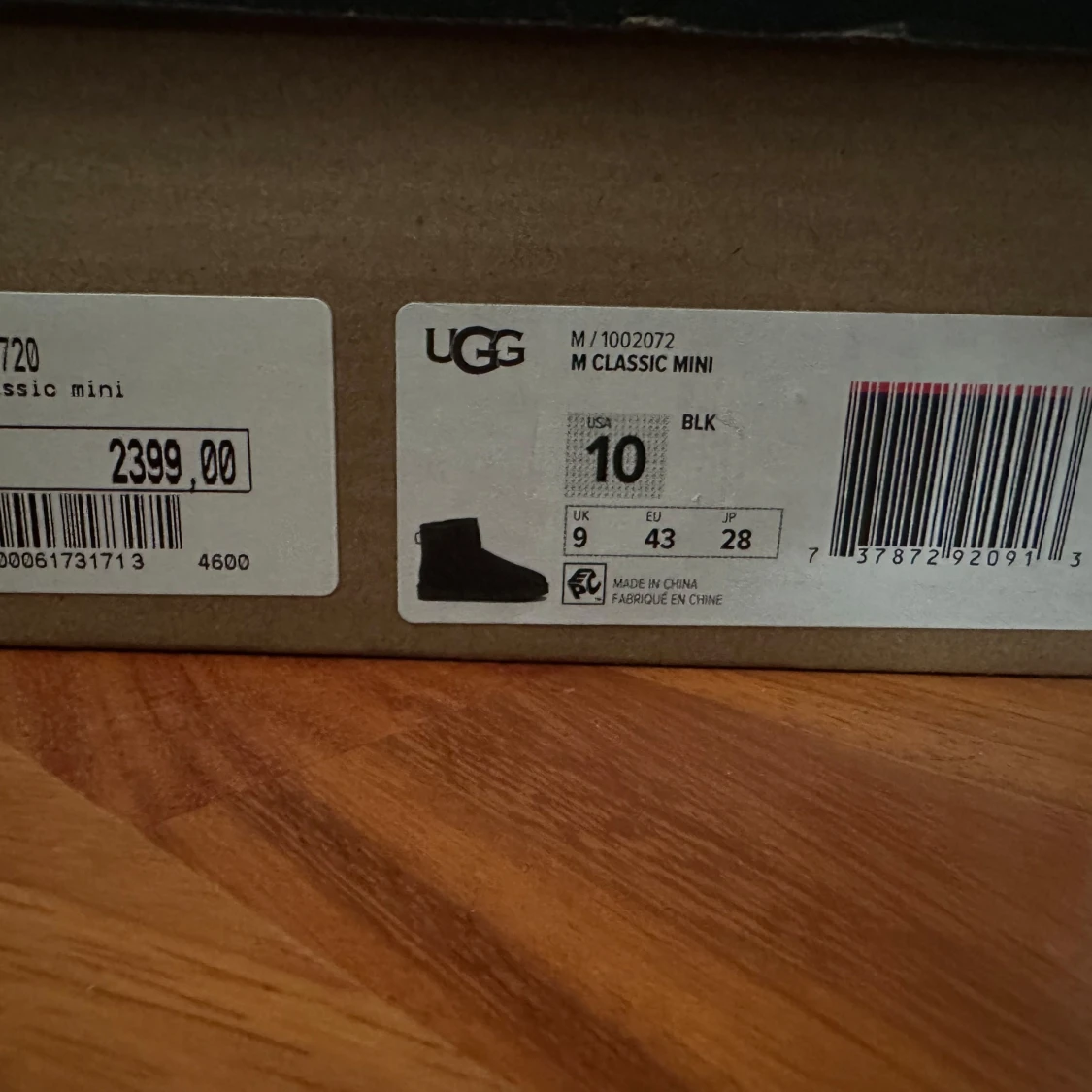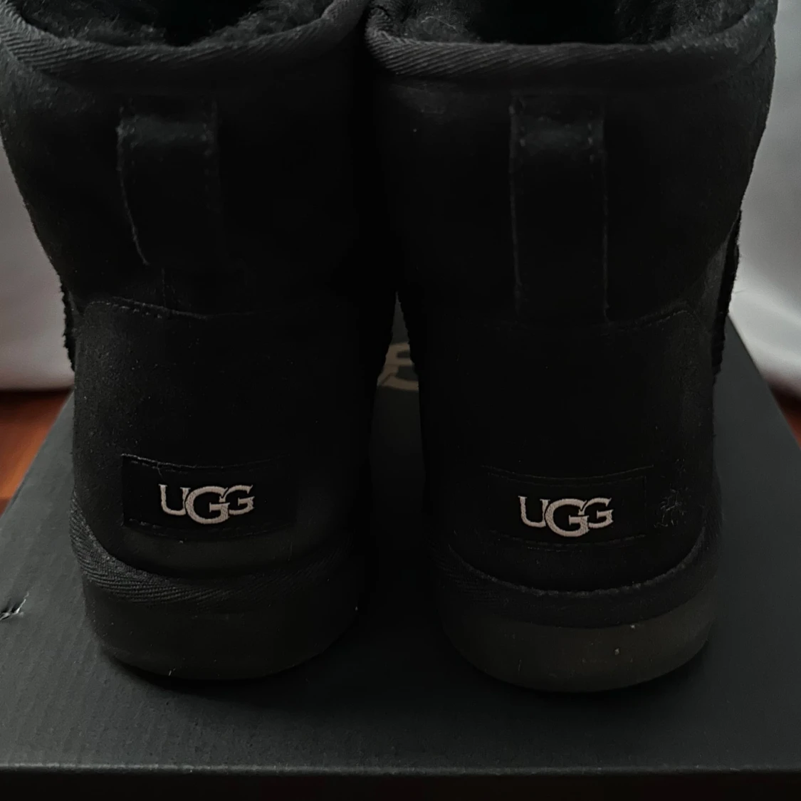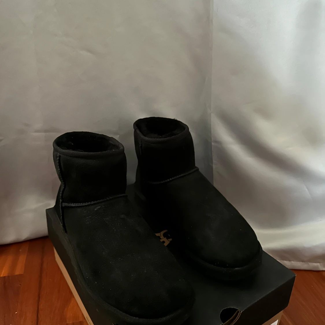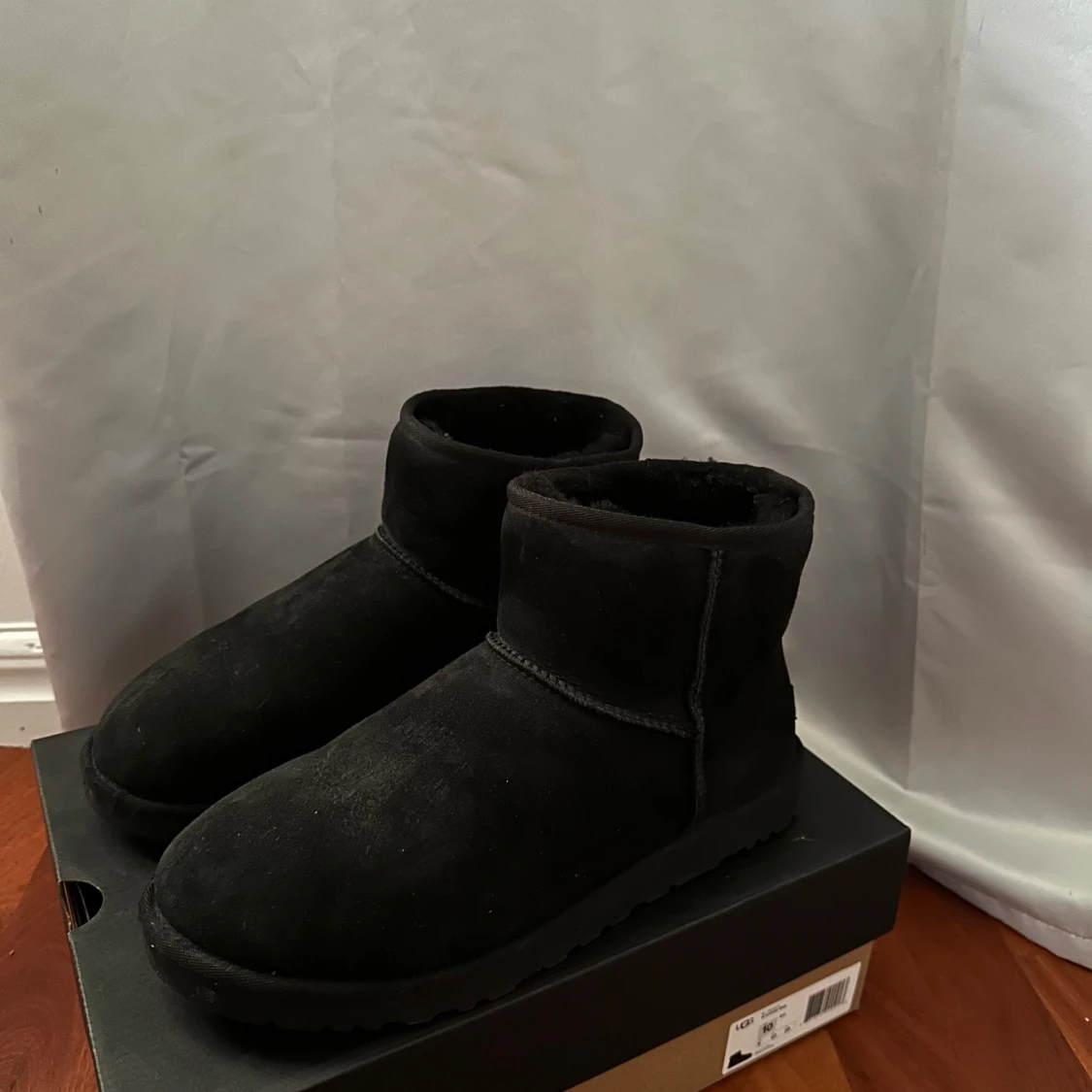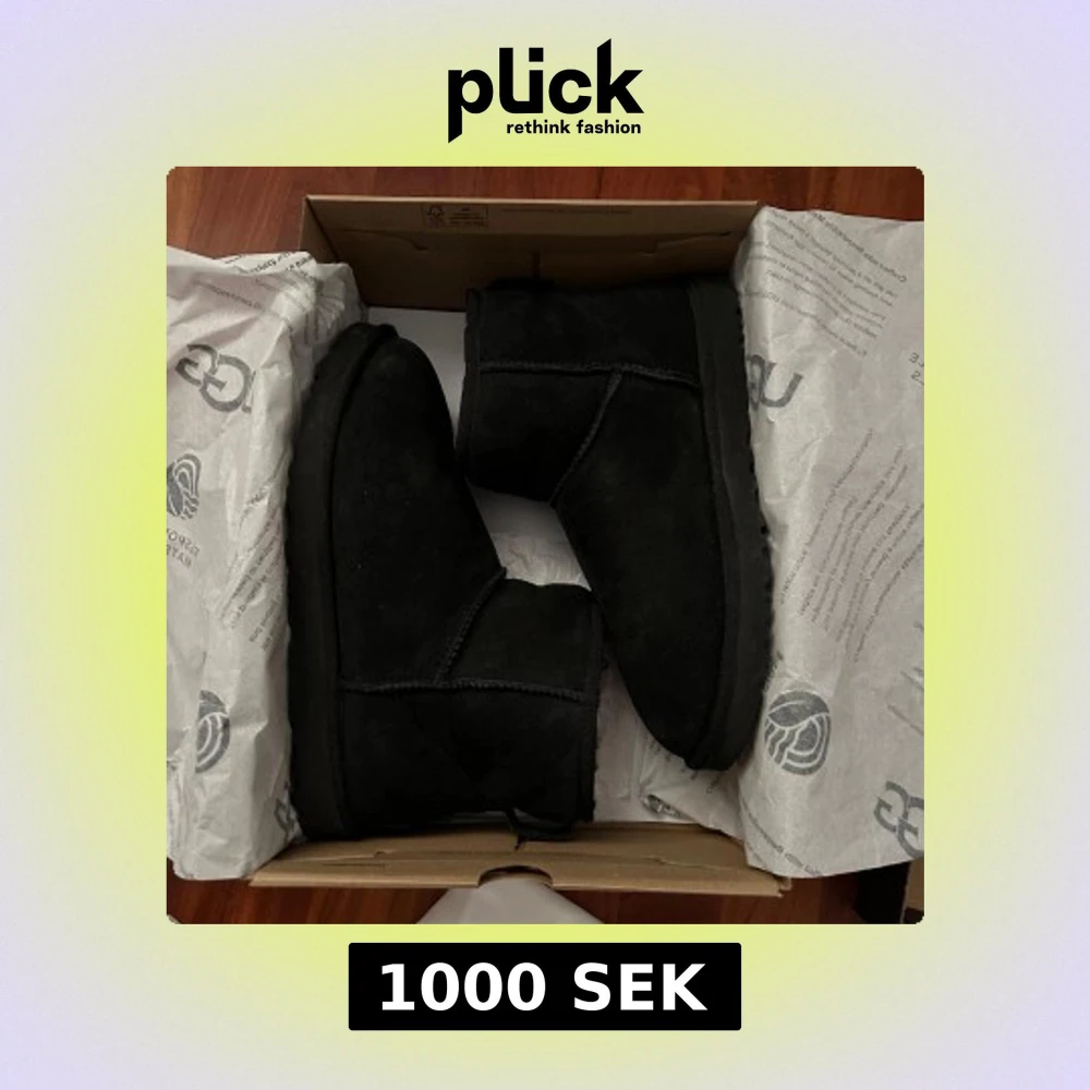 Säljer ett par svarta UGG Classic Mini boots i mocka. Skorna har en låg skaftmodell och är fodrade för extra värme. Perfekta för kyliga dagar och har en klassisk rund tå samt platt sula.