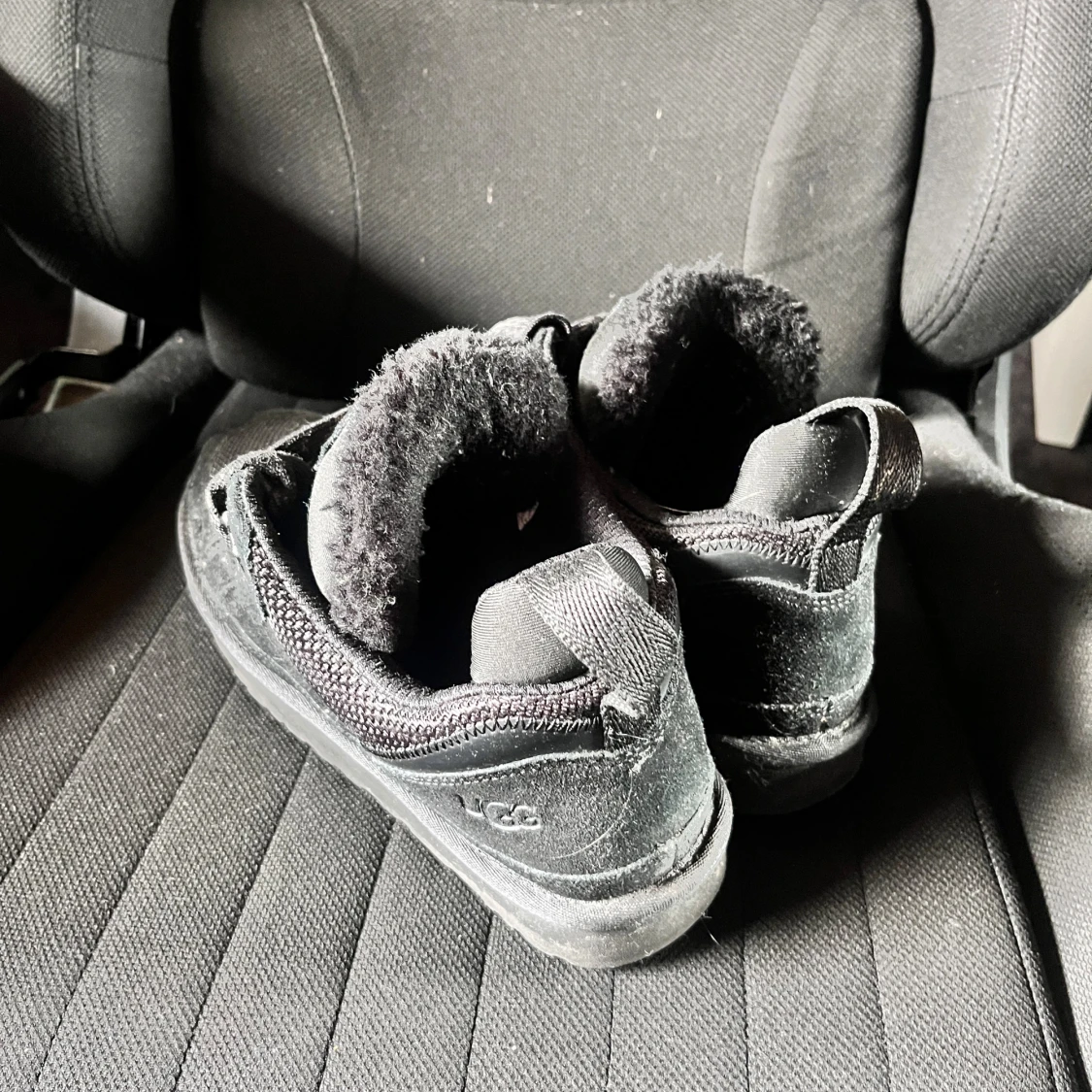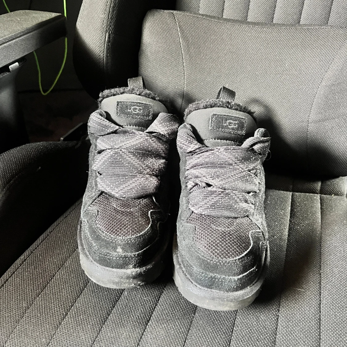 Använda endast fåtal gånger, i princip nytt skick!! Är storlek 41, men sitter stort har en stor storleks variation då man kan göra de ”mindre eller större”. Svarta sneakers från UGG med breda snören, mesh och mockadetaljer samt mjukt pälsfoder på insidan. Skorna har rund tå och platt sula, perfekt för dig som vill ha både stil och komfort. UGG-logga på plösen och hälen.