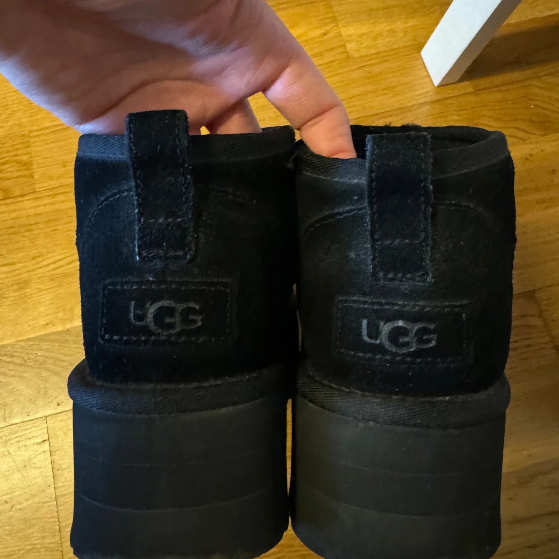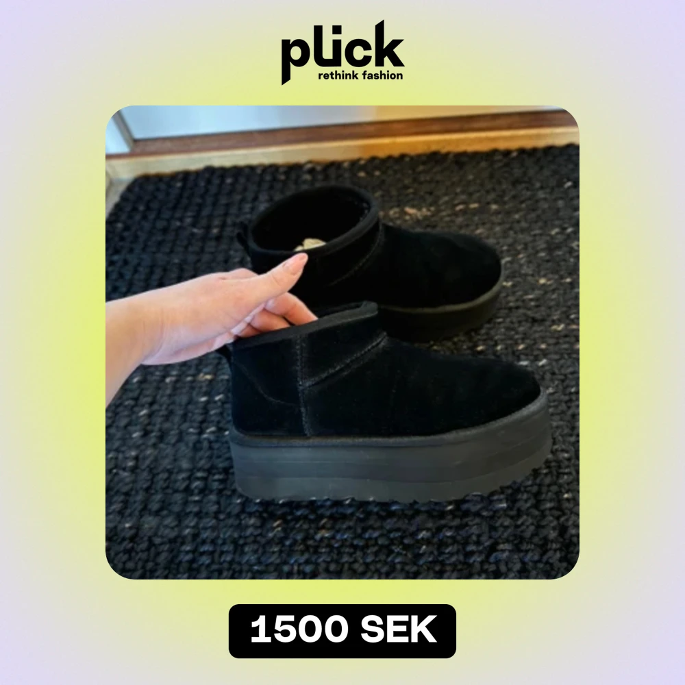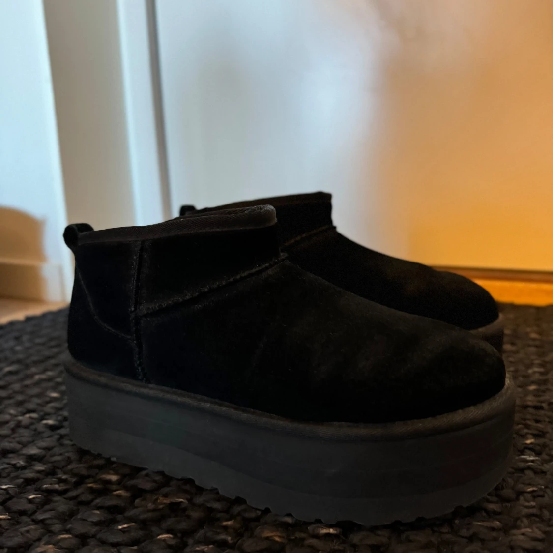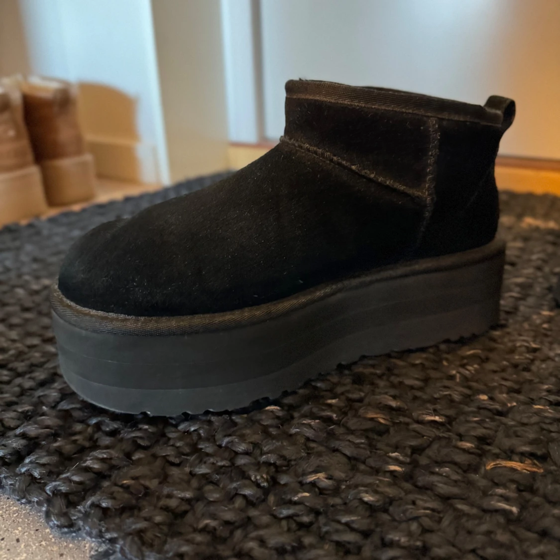 Säljer nu mina älskade UGG mini platform i svart mocka. Storlek 38-38,5. Inköpta vintern 2024 så endast använda en halv säsong. Säljer då jag behöver plats för annat tyvärr. Impregnerade och fina i sitt skick!
