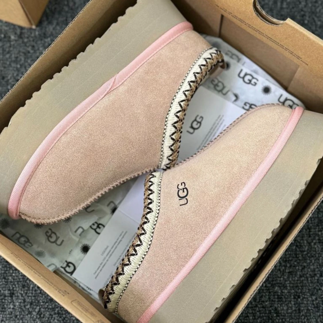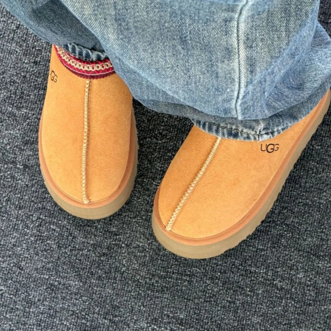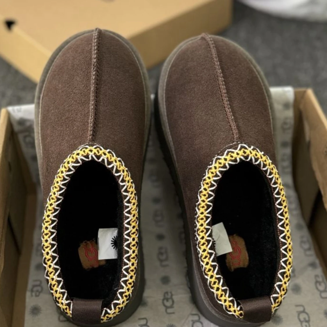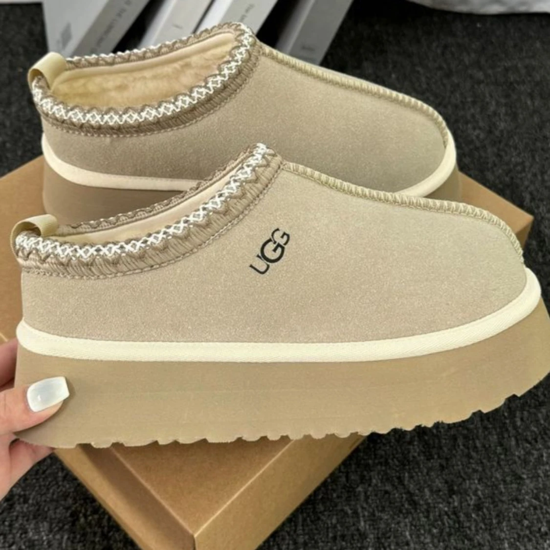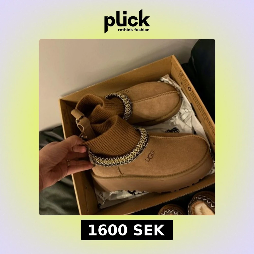 UGG boots med chunky plattformsula i mocka, finns i beige, brun, ljusbrun och rosa. Dekorativt broderi runt öppningen och vissa modeller har ribbstickad mudd. Perfekta för kalla dagar med sin mysiga insida och coola look.