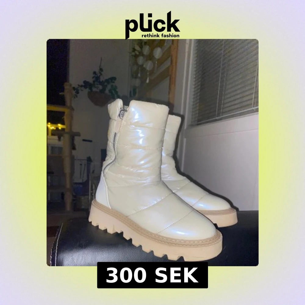 Säljer ett par häftiga & varma boots i creme & quiltad, glansig metallicfärg. De har rund tå och dragkedja på sidan för enkel påtagning. Perfekta för vinter. Bootsen har endast använts en vinter och är i väldigt gott skick! Storlek 38. 🌸