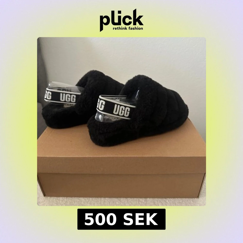 Säljer ett par svarta fluffiga tofflor från UGG med öppen tå och elastiskt band med logga. Perfekta för att hålla fötterna varma och bekväma utomhus.