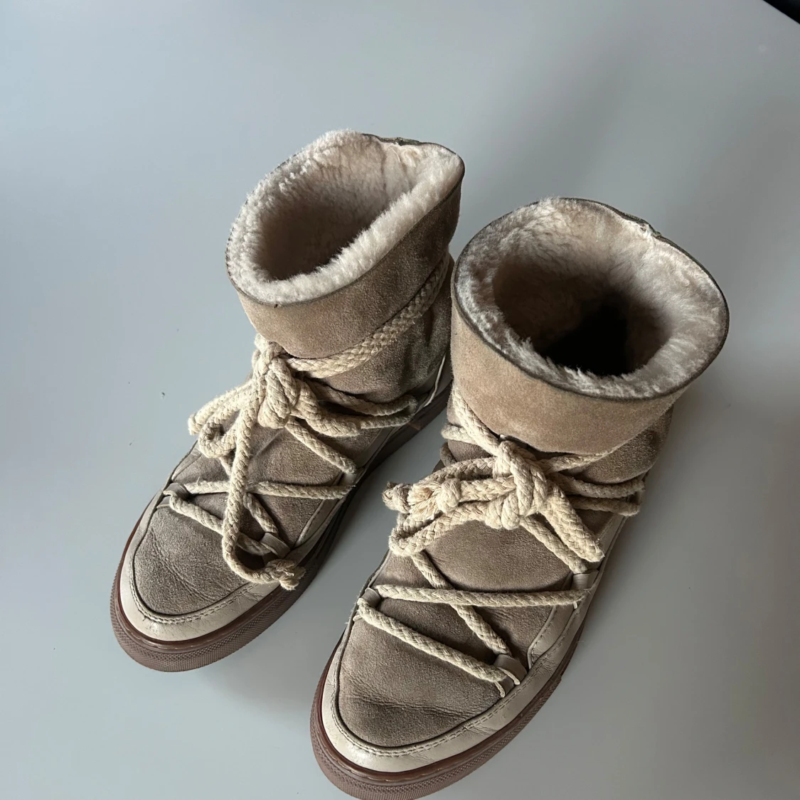 Säljer ett par snygga och varma beige vinterboots från Inuikii. De är i mocka med en mysig pälsfodring och har en cool snörning framtill. Perfekta för kalla vinterdagar! 🥶De är använda men har mycket kvar att ge!!❤️de är lite kreasade och ena skon är lite sliten där bak, vilket är något som knappast syns