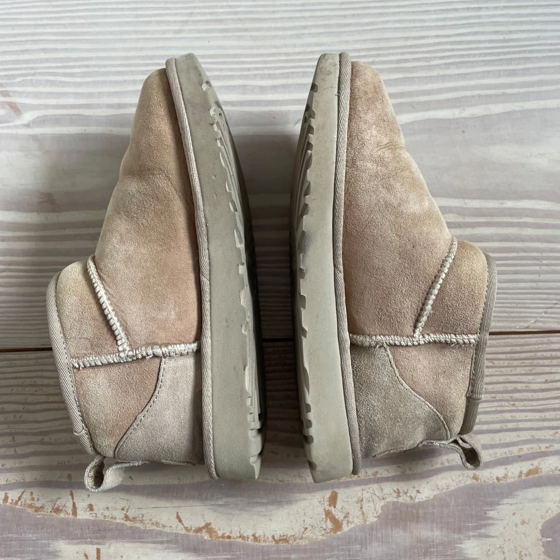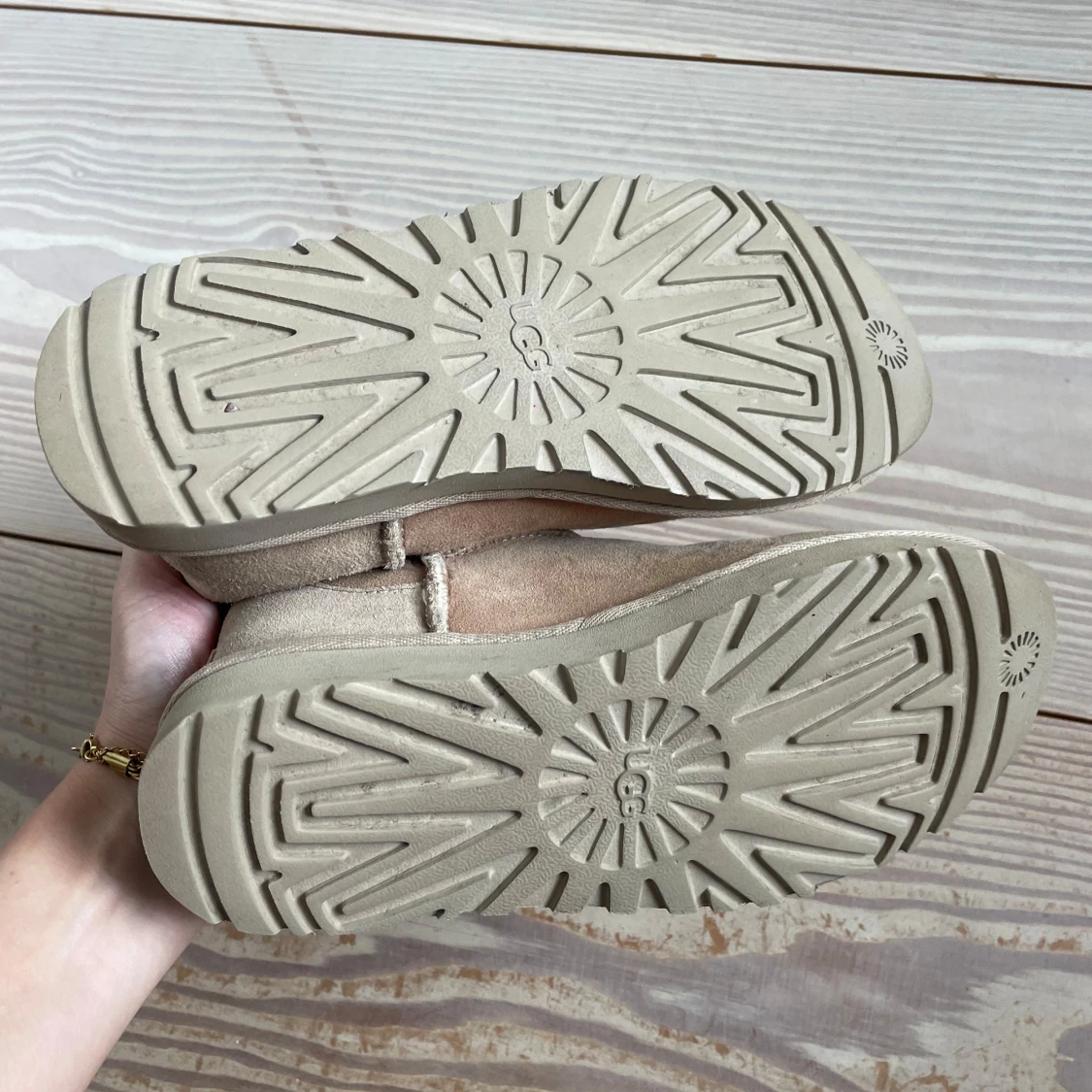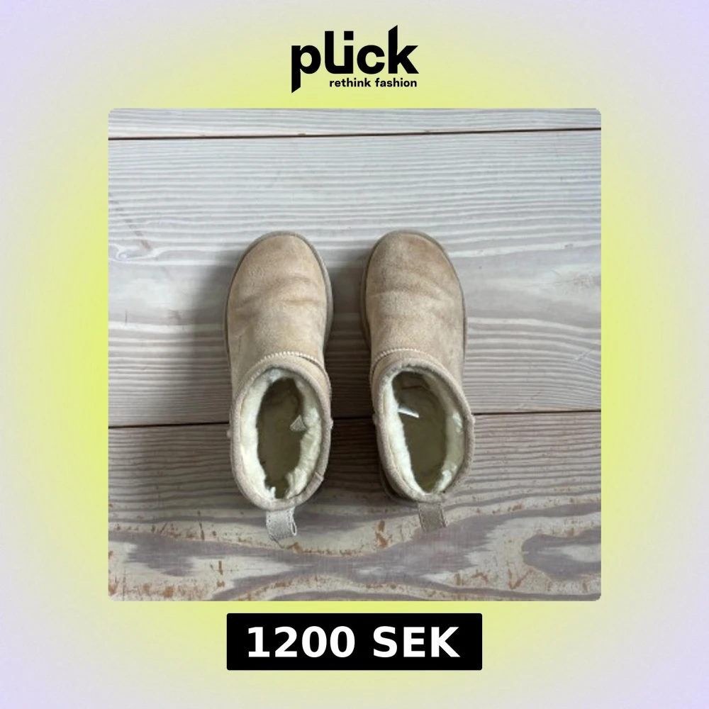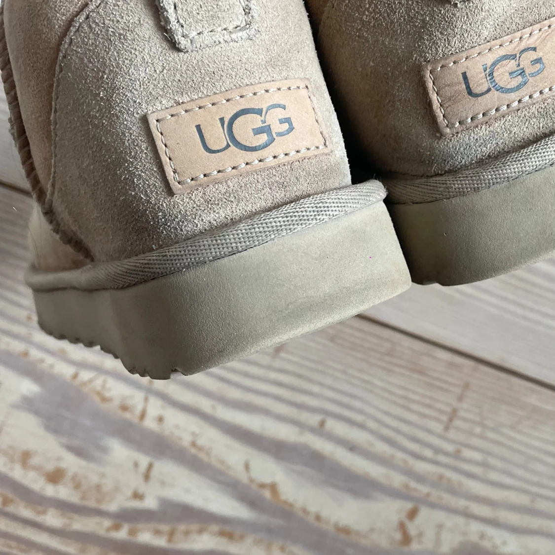 Beige boots från UGG i mjuk mocka med fluffigt fårfoder på insidan. Skorna har rund tå, platt sula och klassisk UGG-logga bak. Endast använd mellan 5-10 gånger!!